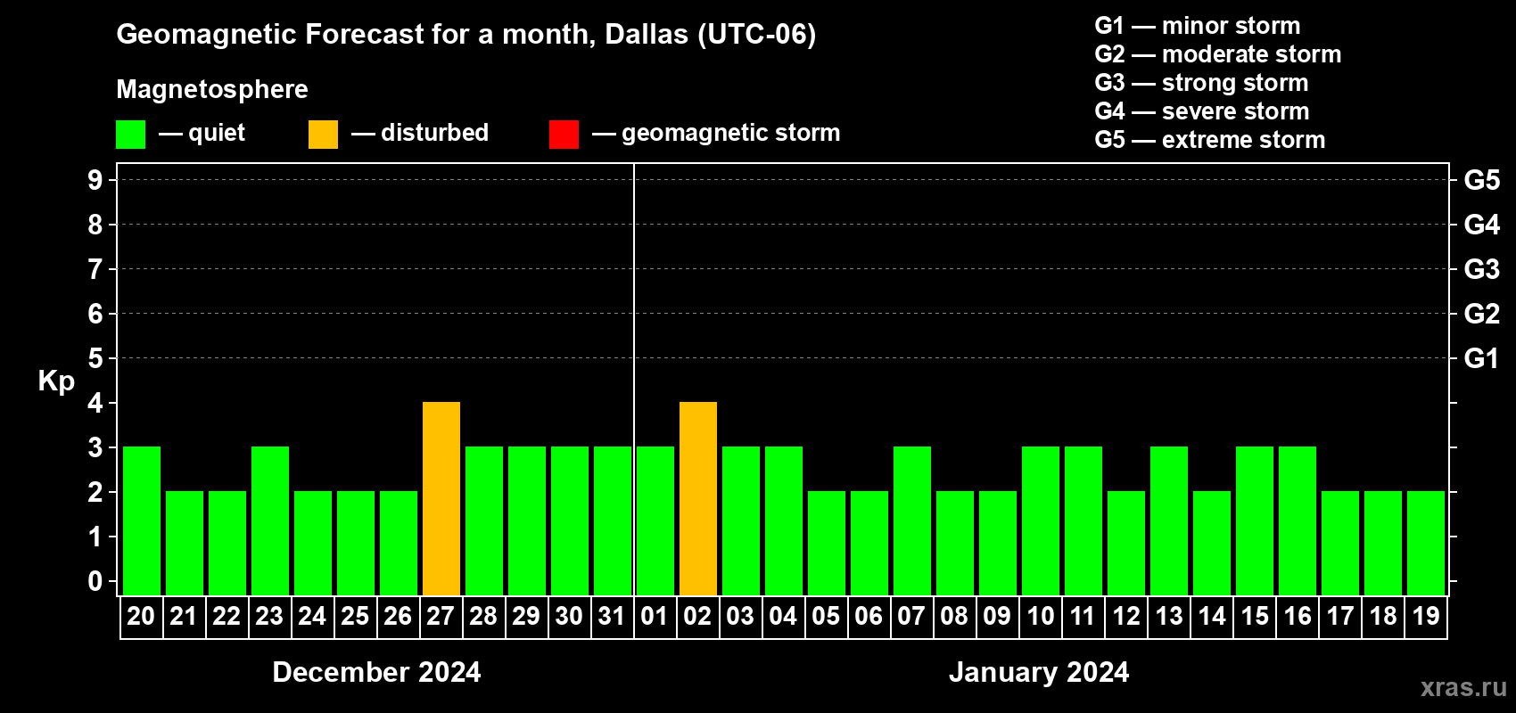 Geomagnetic storm forecast in Dallas for Dec 20, 2023