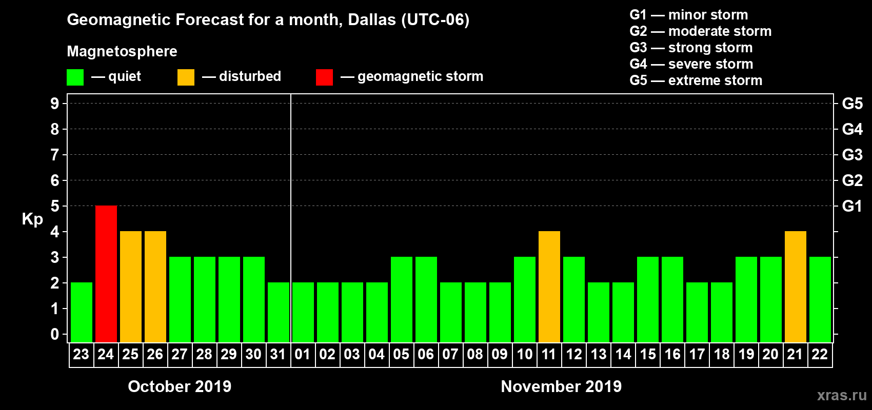Geomagnetic storm forecast in Dallas for Oct 23, 2019