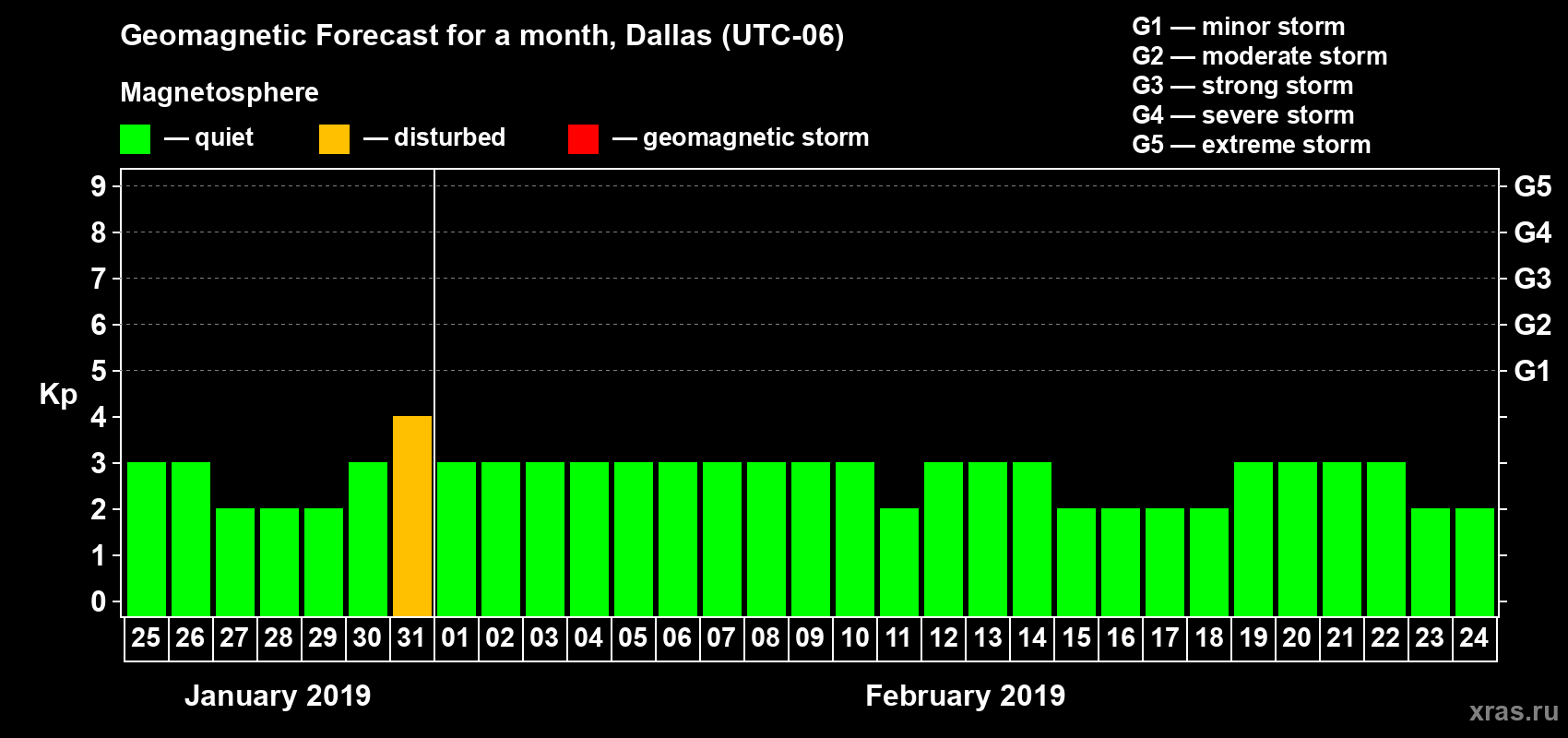 Geomagnetic storm forecast in Dallas for Jan 25, 2019