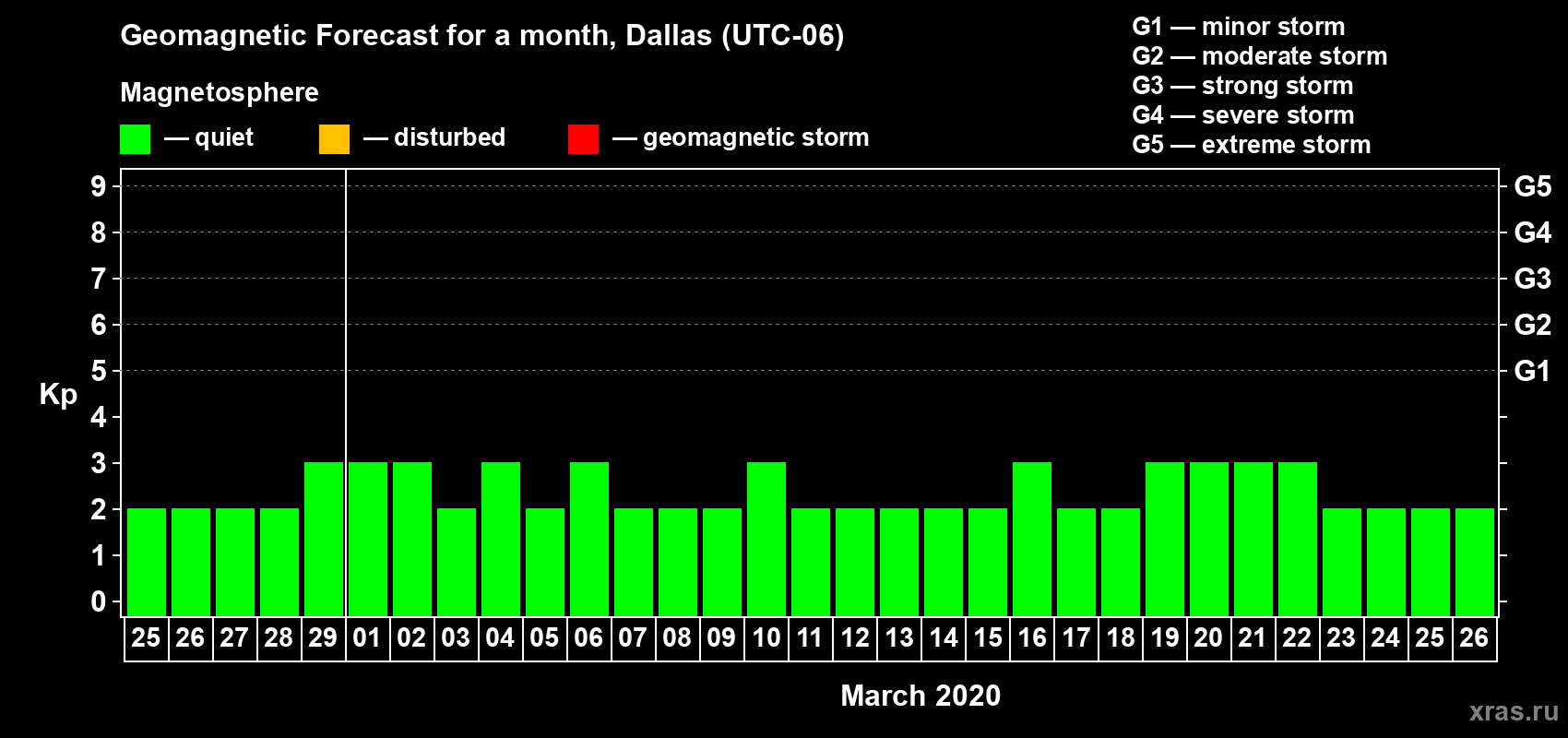 Geomagnetic storm forecast in Dallas for Feb 25, 2020