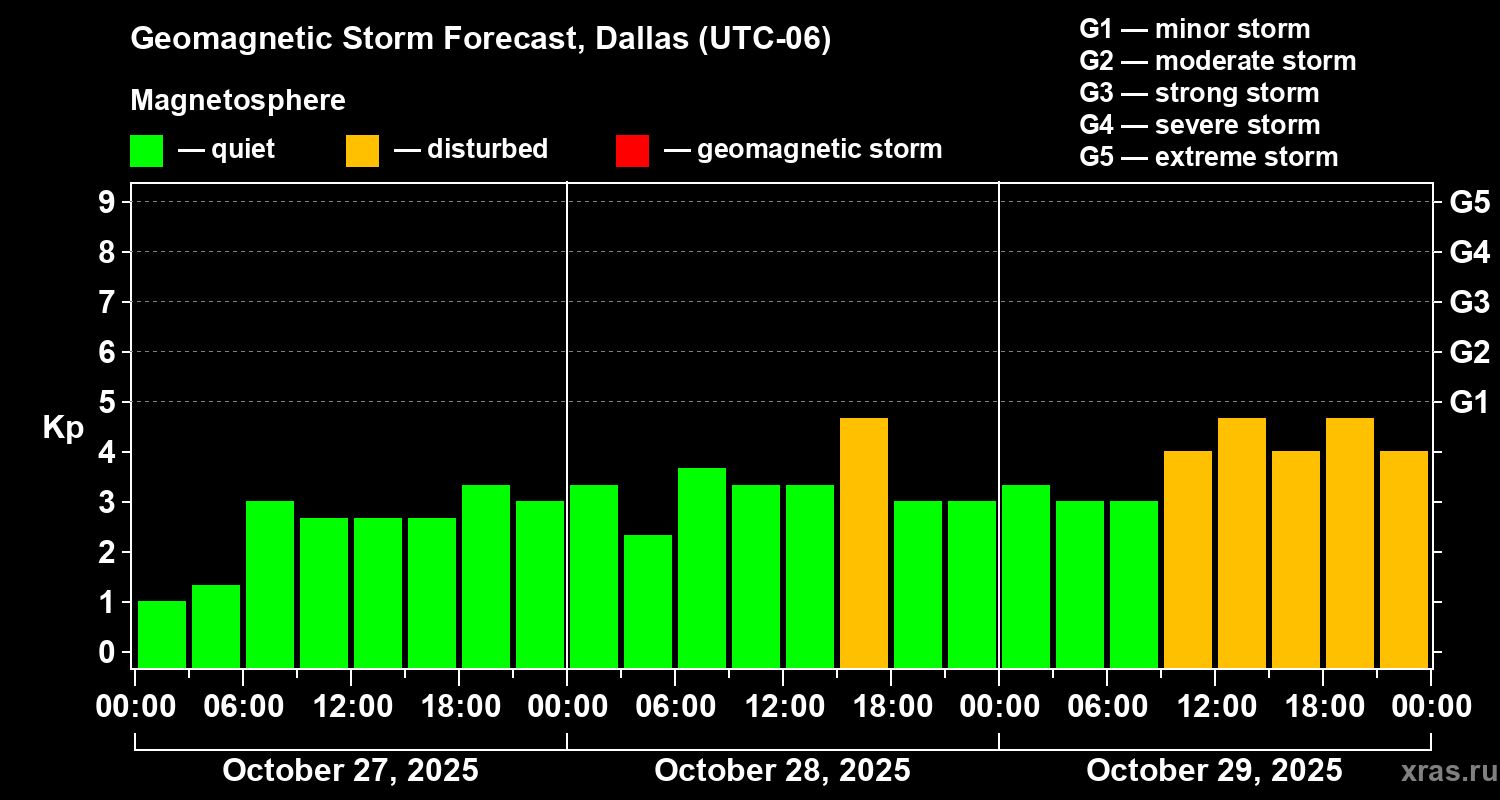 Geomagnetic storm forecast in Dallas for Oct 27, 2025