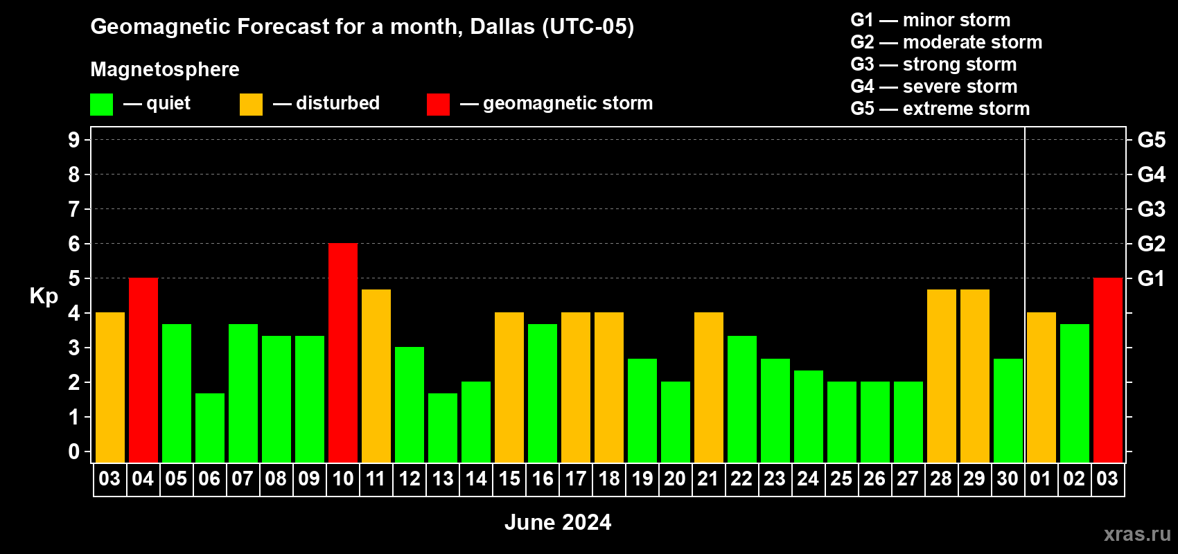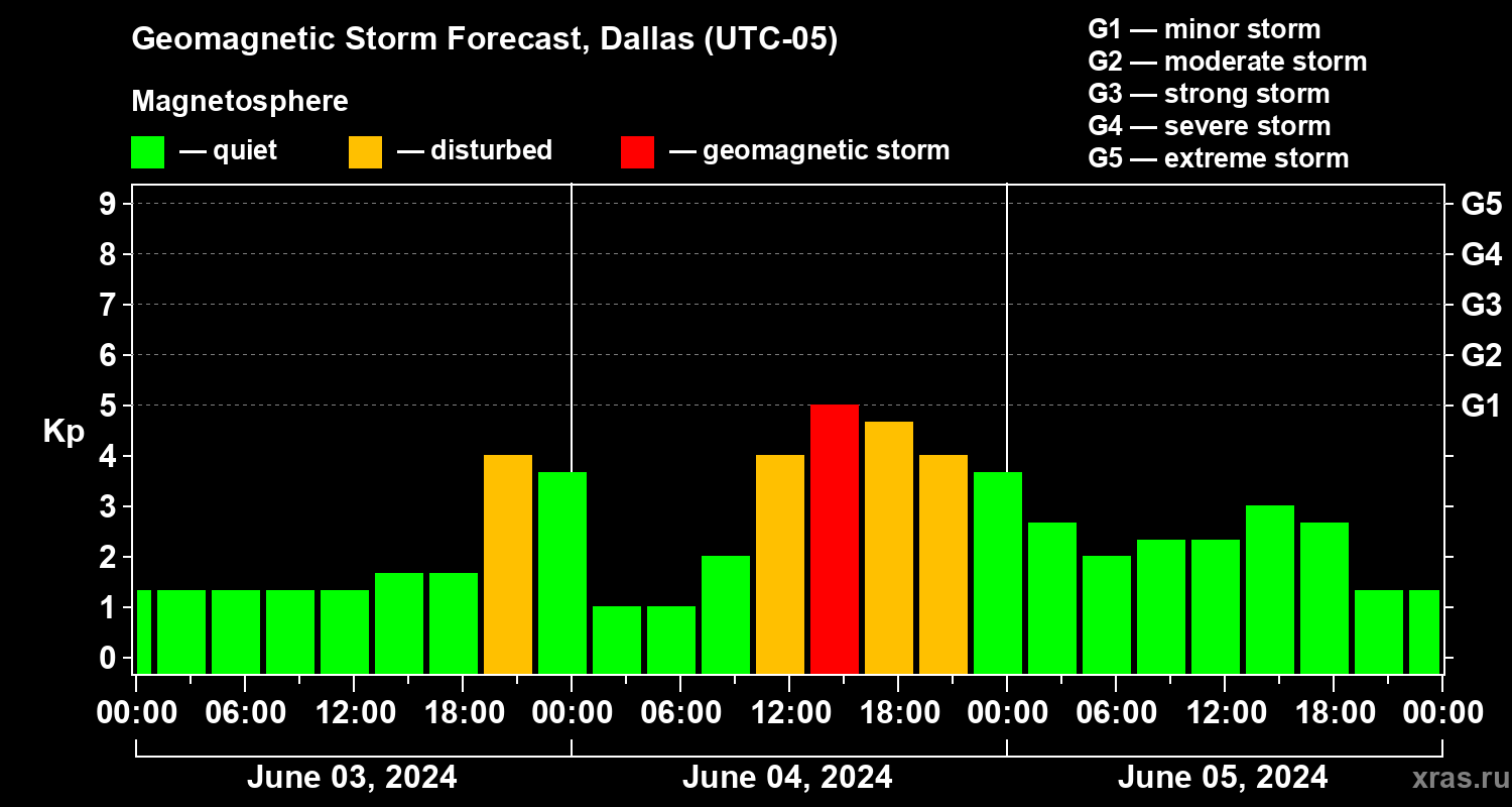 Geomagnetic storm forecast in Dallas for Jun 03, 2024