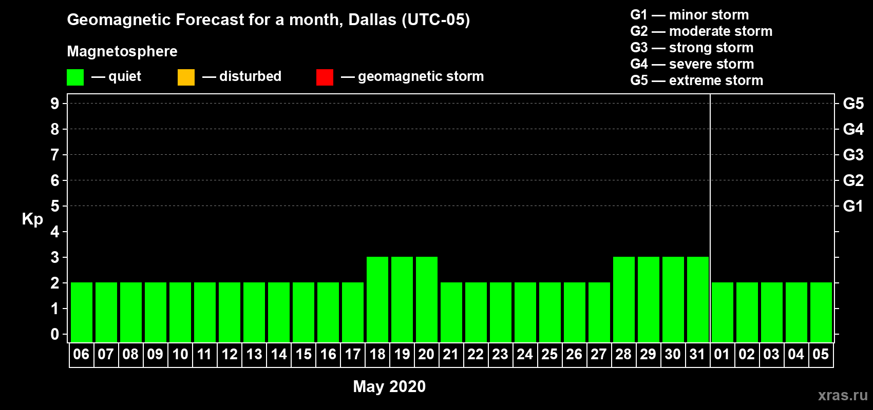 Geomagnetic storm forecast in Dallas for May 06, 2020