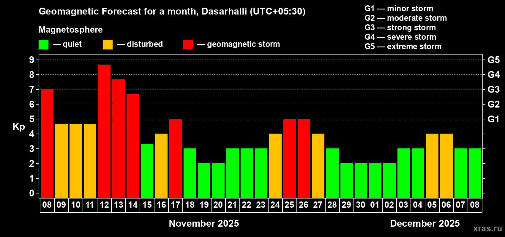 Geomagnetic storm forecast in Dasarhalli for Nov 08, 2025