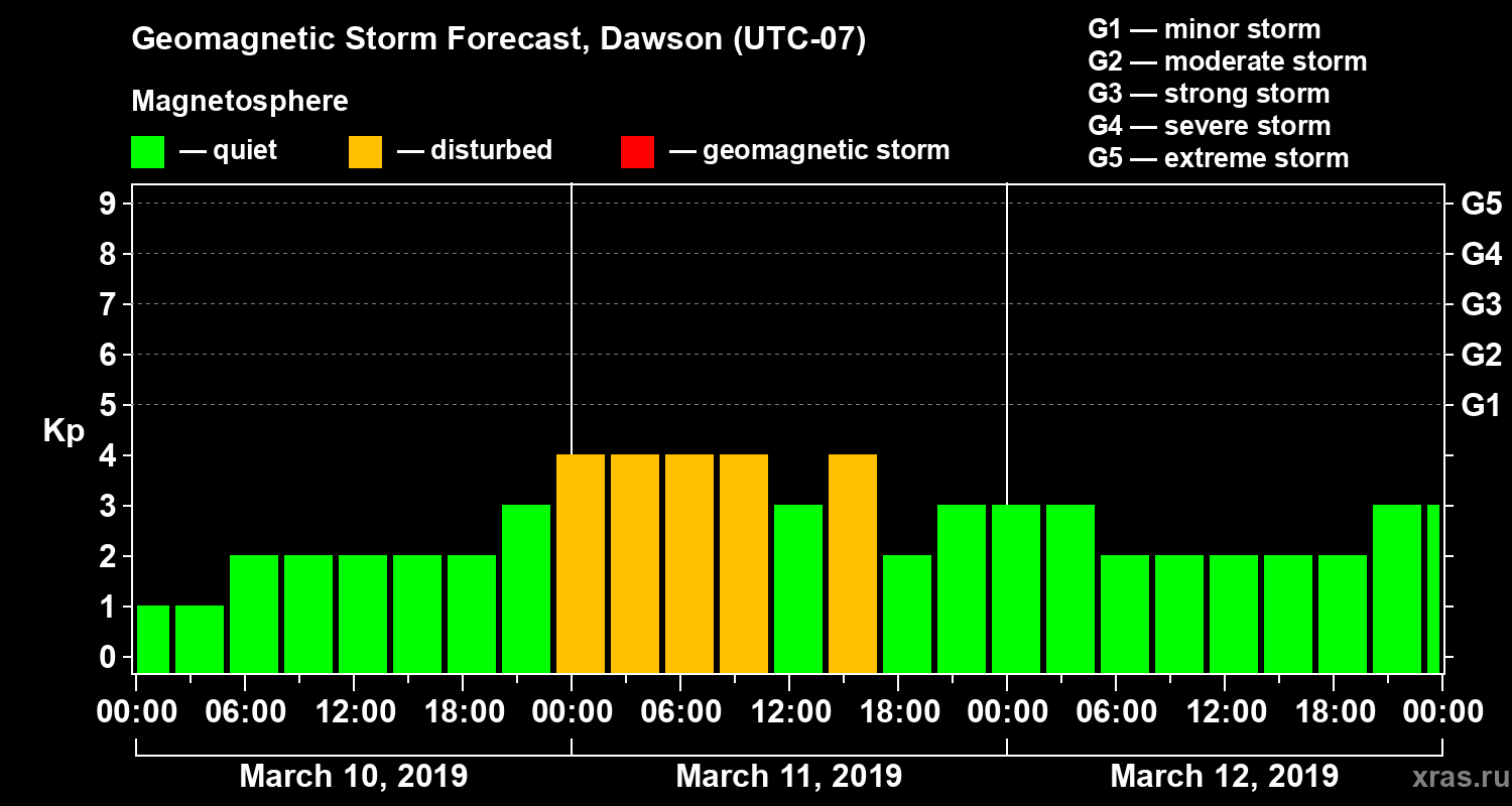 Geomagnetic storm forecast in Dawson for Mar 10, 2019