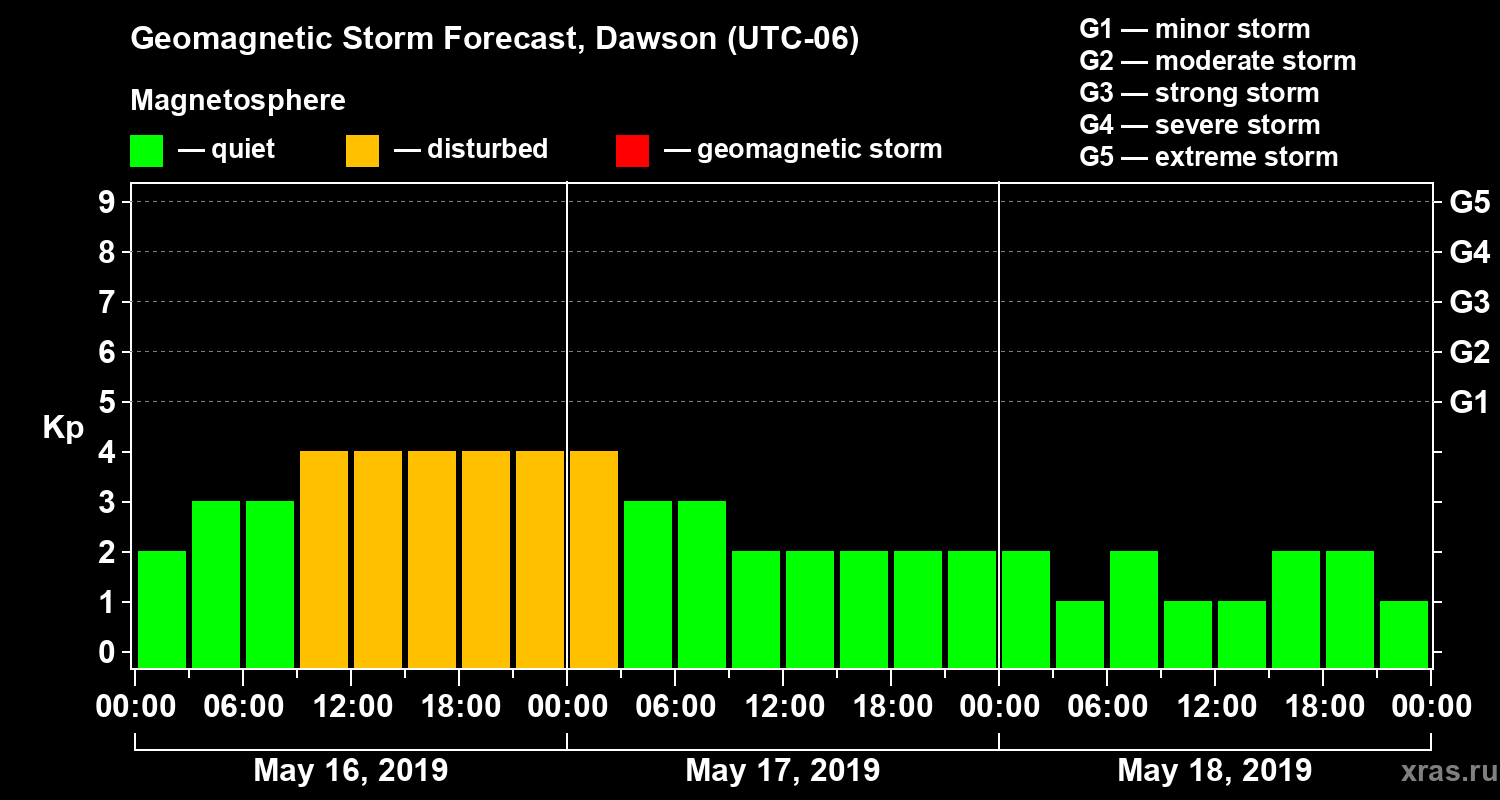 Geomagnetic storm forecast in Dawson for May 16, 2019