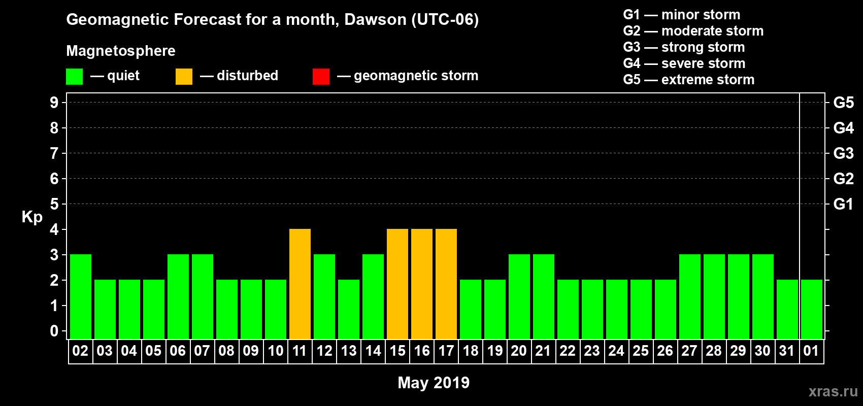 Geomagnetic storm forecast in Dawson for May 02, 2019