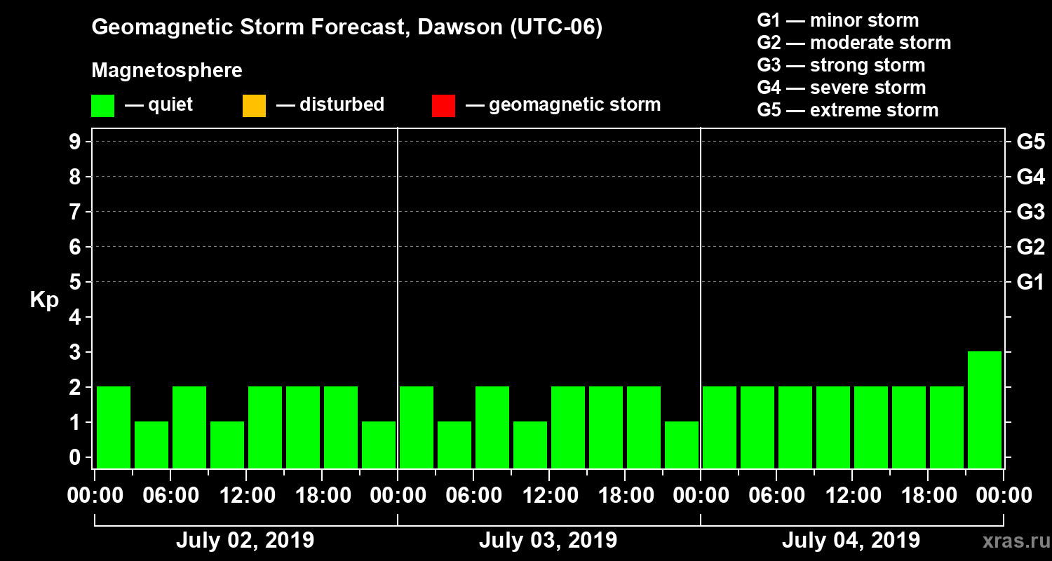 Geomagnetic storm forecast in Dawson for Jul 02, 2019
