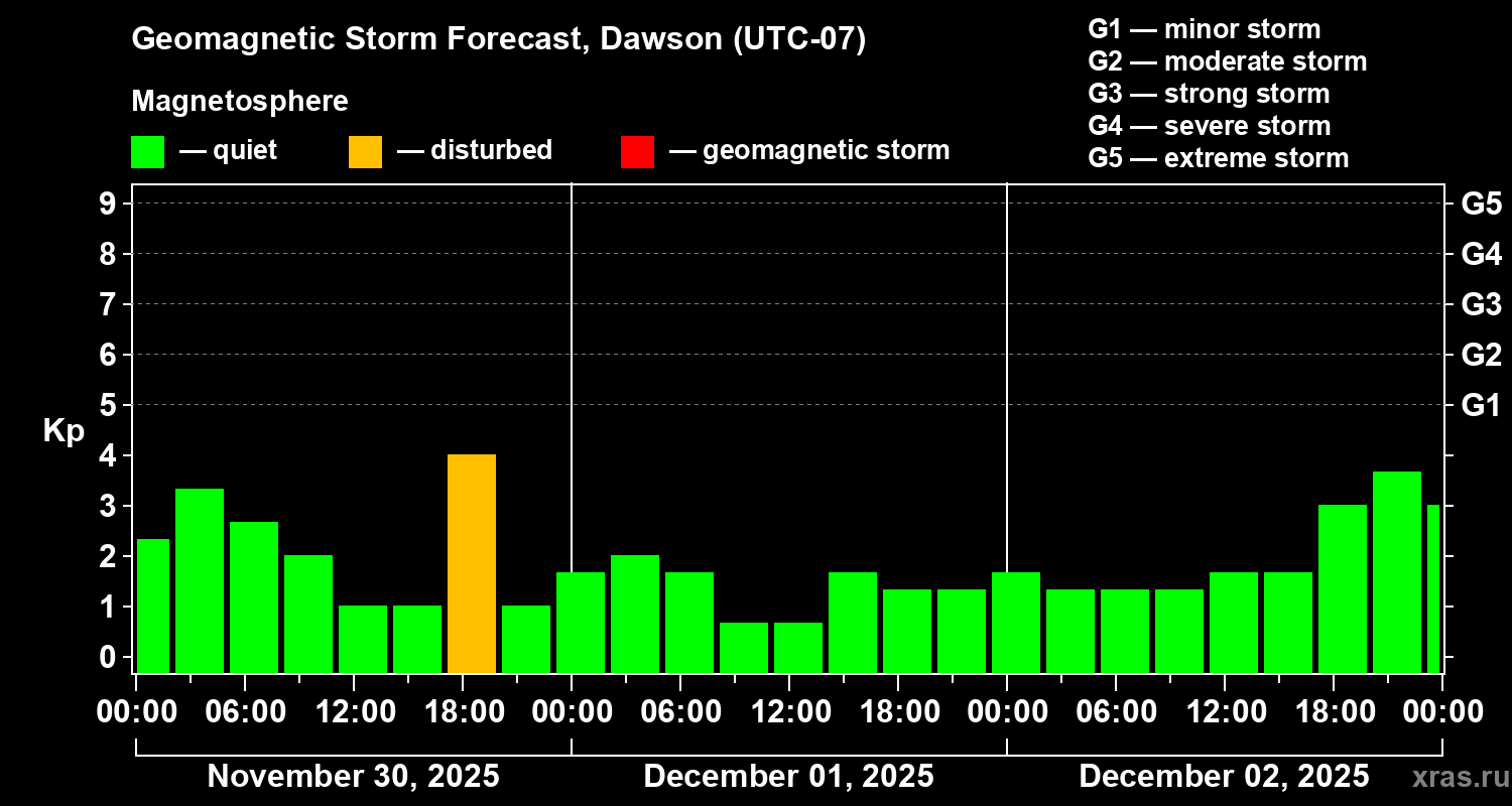Geomagnetic storm forecast in Dawson for Nov 30, 2025