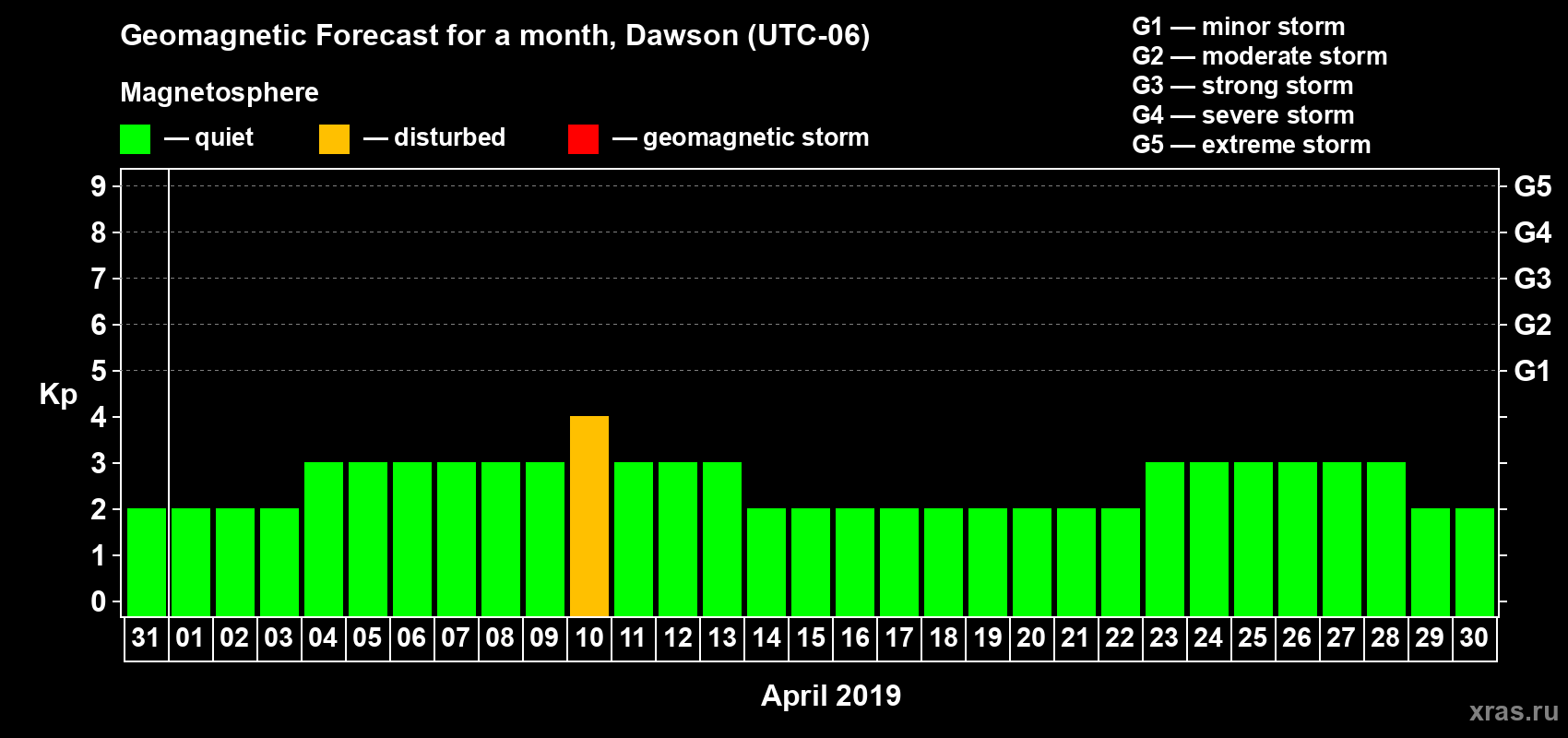 Geomagnetic storm forecast in Dawson for Mar 31, 2019