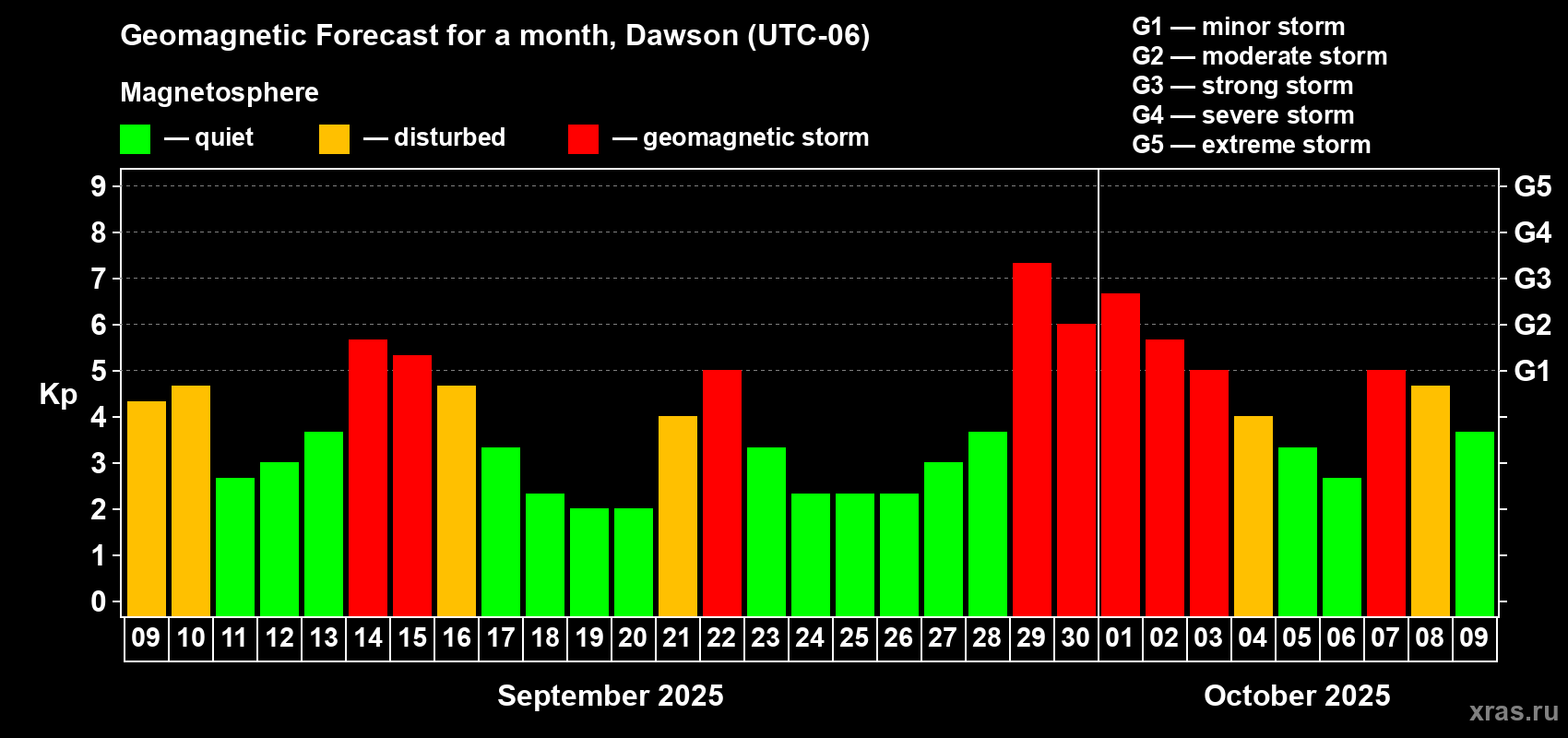 Geomagnetic storm forecast in Dawson for Sep 09, 2025