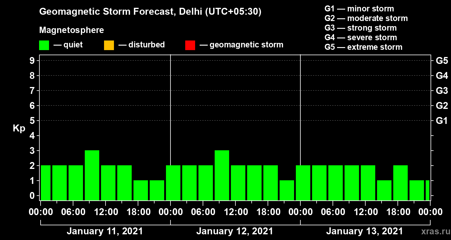 Geomagnetic storm forecast in Delhi for Jan 11, 2021