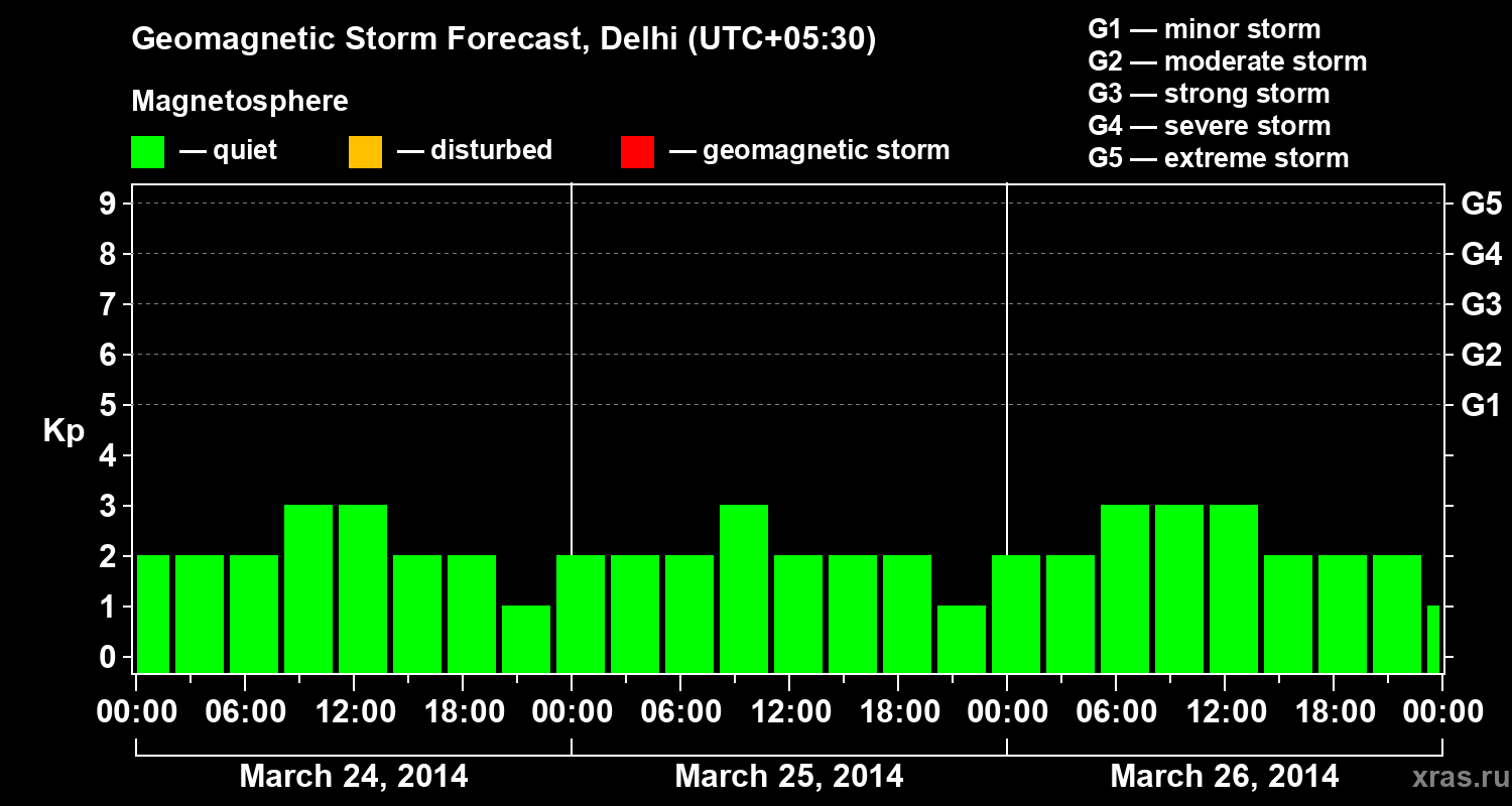 Geomagnetic storm forecast in Delhi for Mar 24, 2014