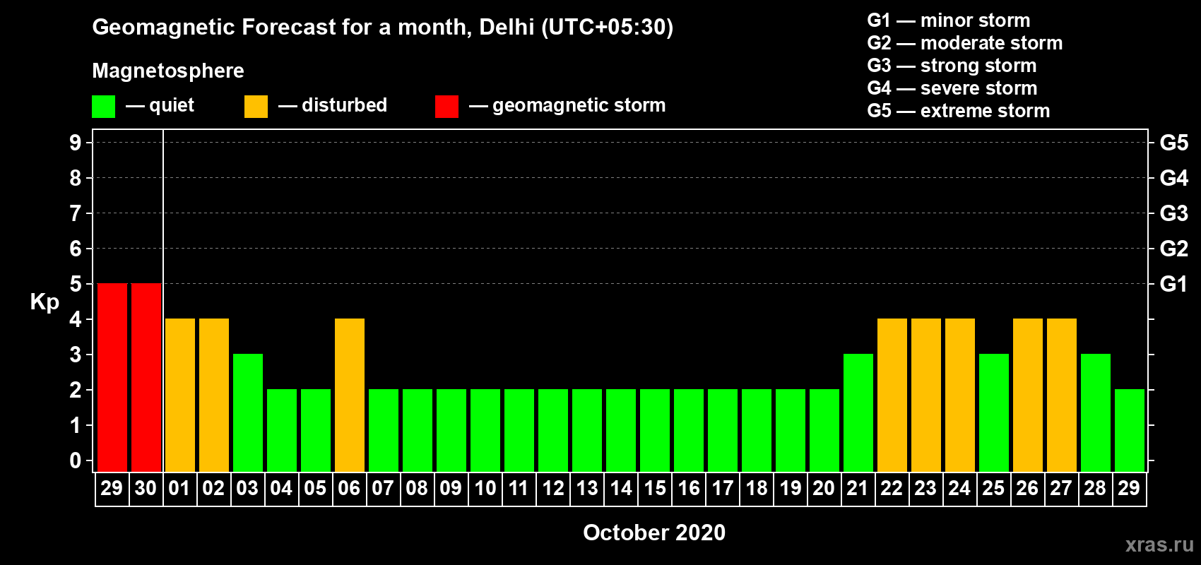 Geomagnetic storm forecast in Delhi for Sep 29, 2020