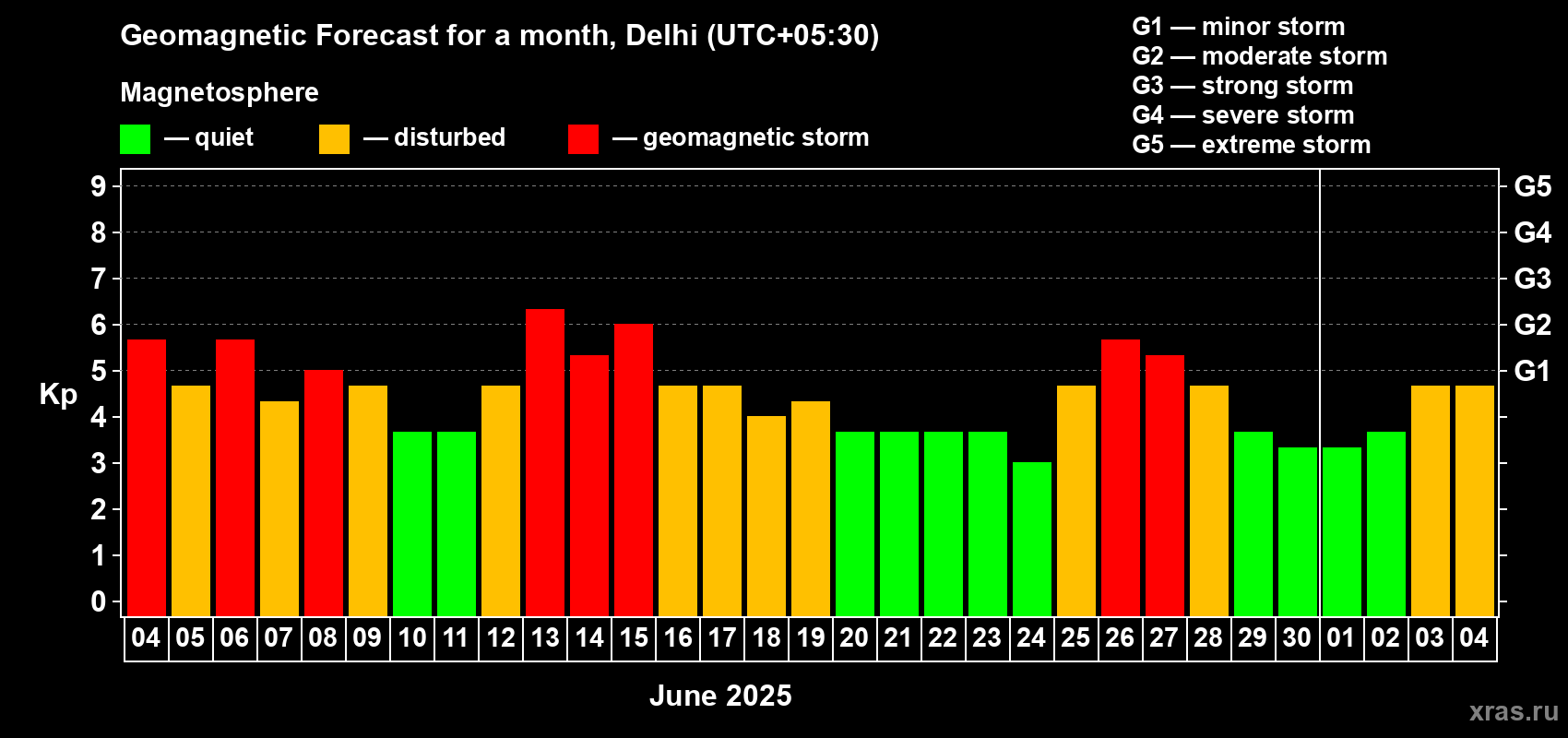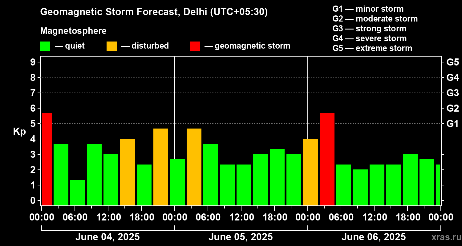 Geomagnetic storm forecast in Delhi for Jun 04, 2025