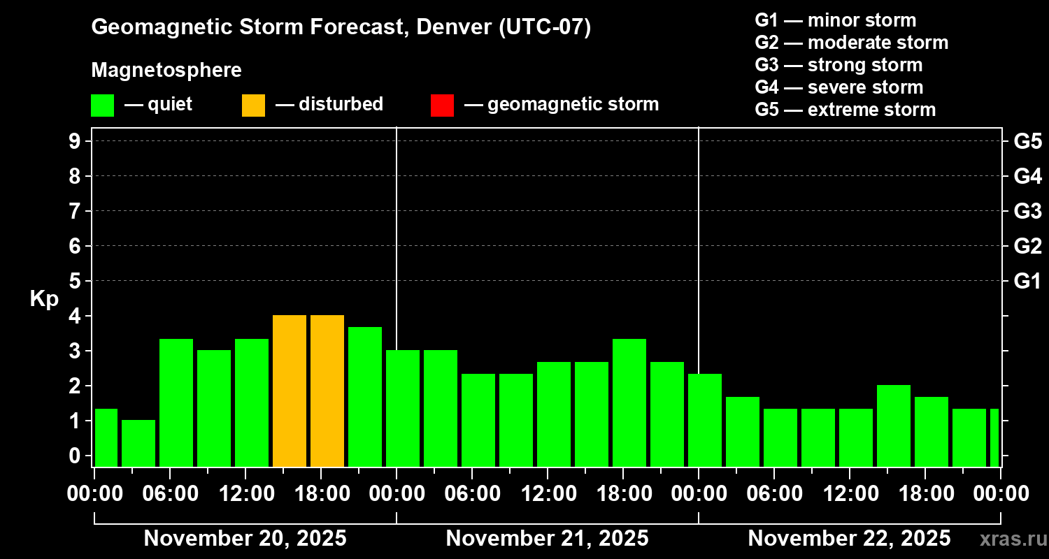 Geomagnetic storm forecast in Denver for Nov 20, 2025