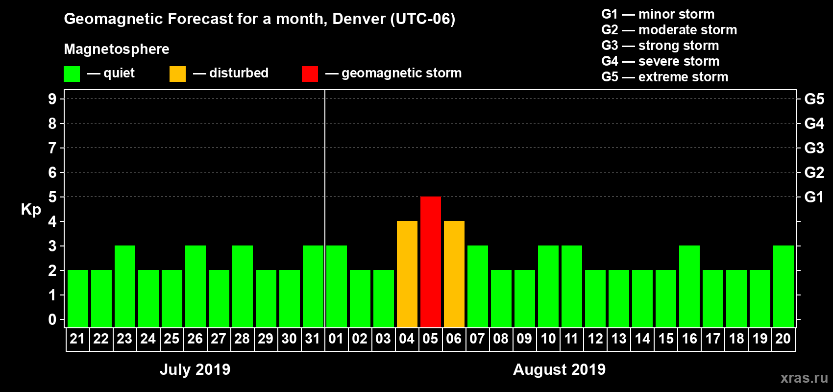 Geomagnetic storm forecast in Denver for Jul 21, 2019
