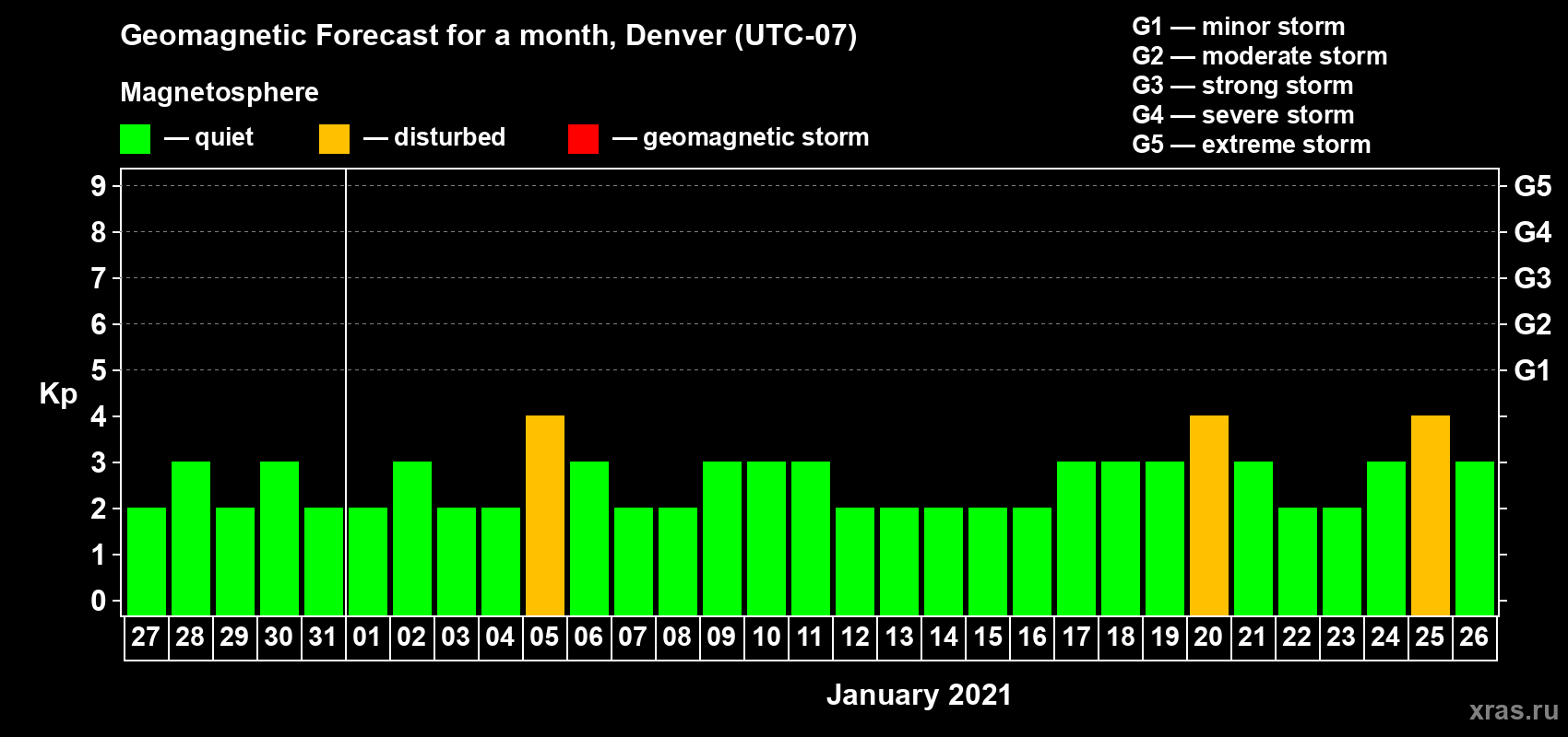 Geomagnetic storm forecast in Denver for Dec 27, 2020