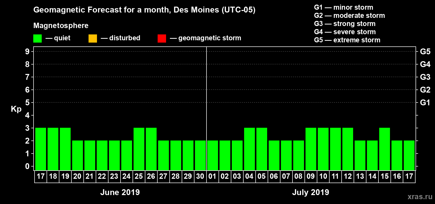 Geomagnetic storm forecast in Des Moines for Jun 17, 2019