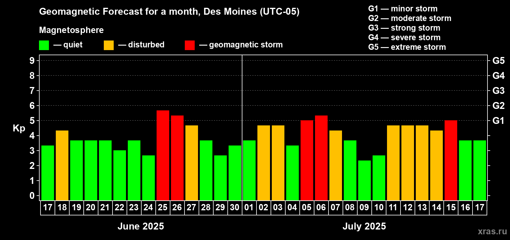 Geomagnetic storm forecast in Des Moines for Jun 17, 2025