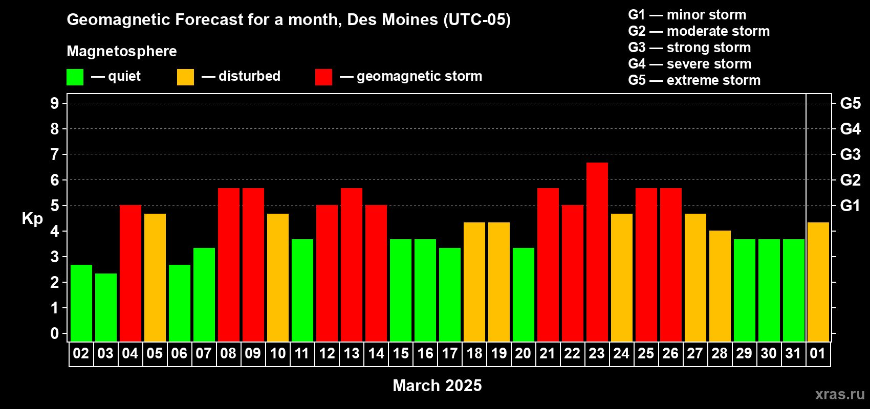Geomagnetic storm forecast in Des Moines for Mar 02, 2025