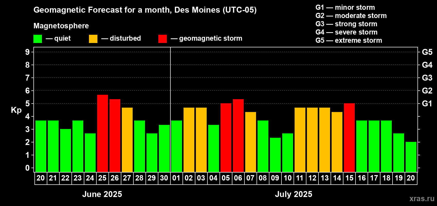 Geomagnetic storm forecast in Des Moines for Jun 20, 2025