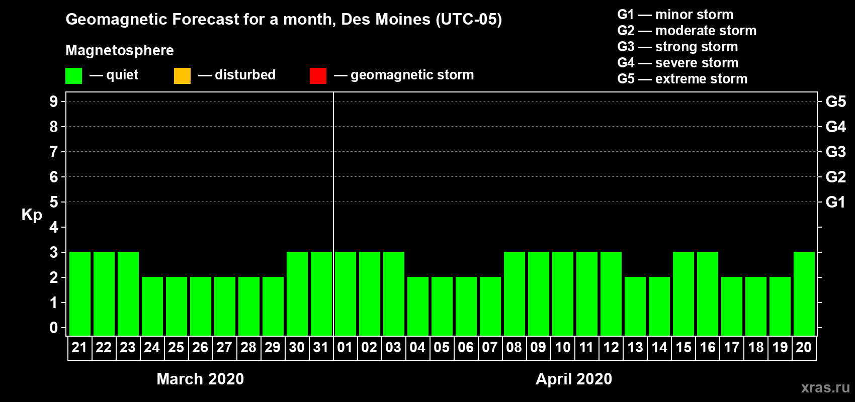 Geomagnetic storm forecast in Des Moines for Mar 21, 2020
