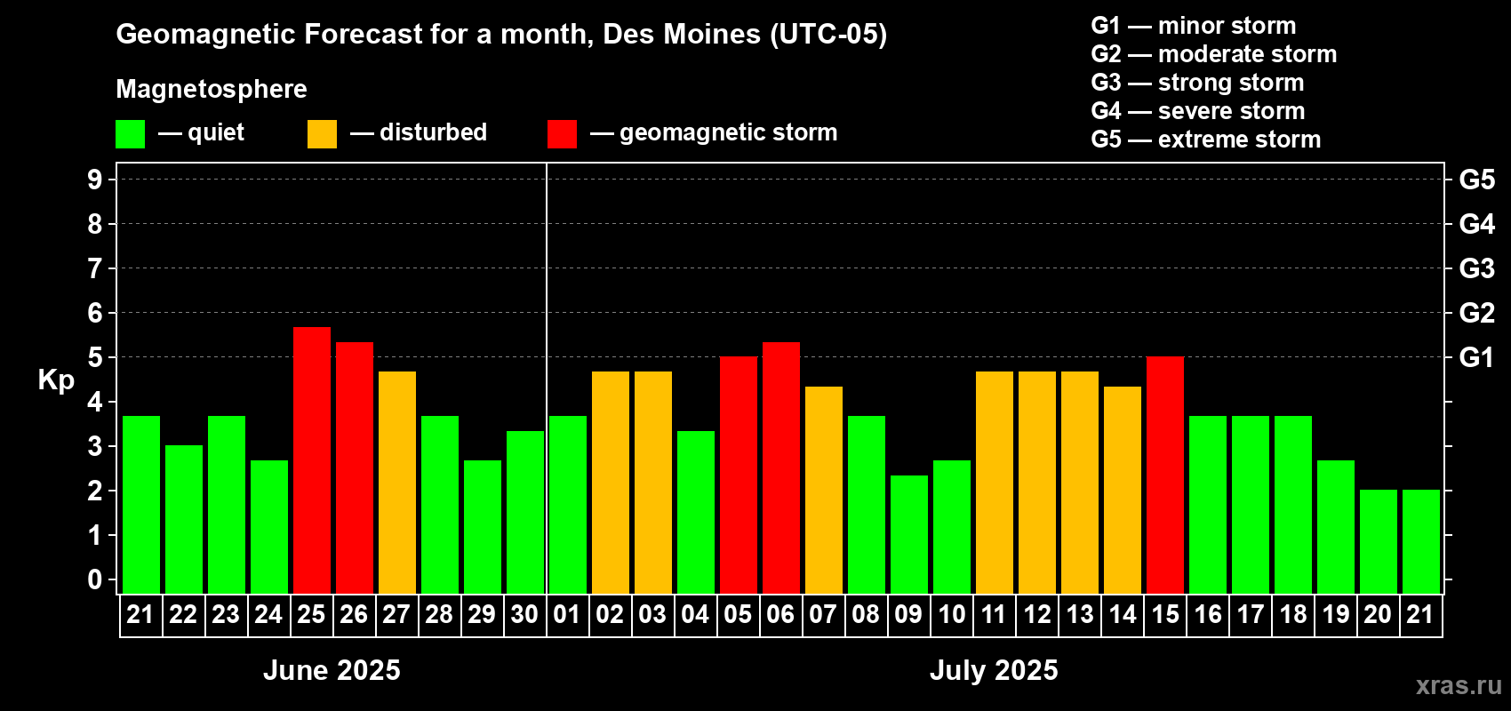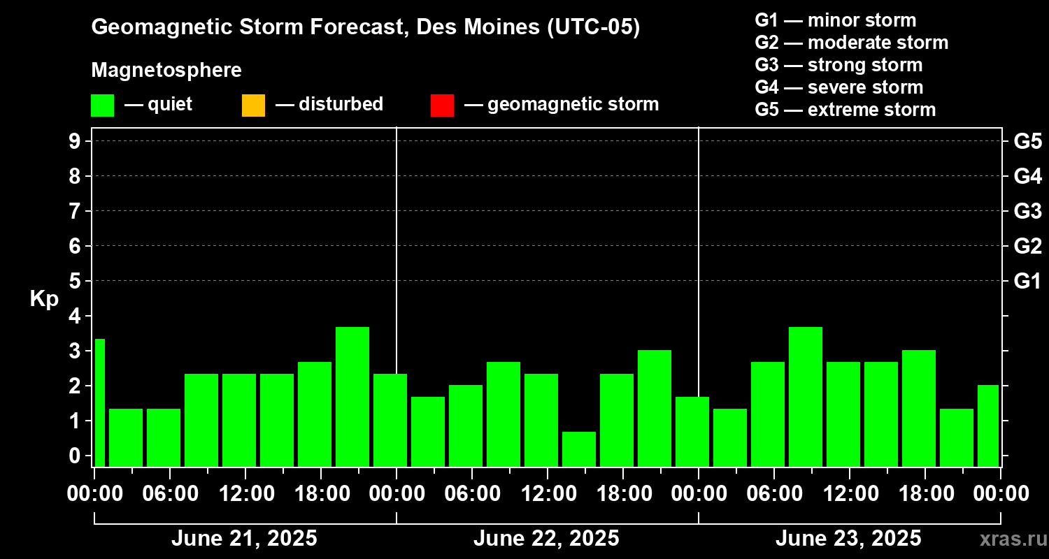Geomagnetic storm forecast in Des Moines for Jun 21, 2025