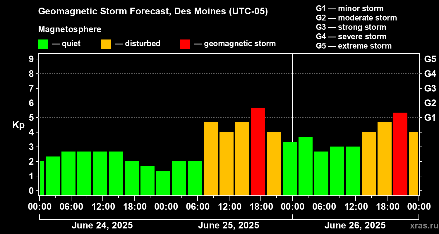 Geomagnetic storm forecast in Des Moines for Jun 24, 2025