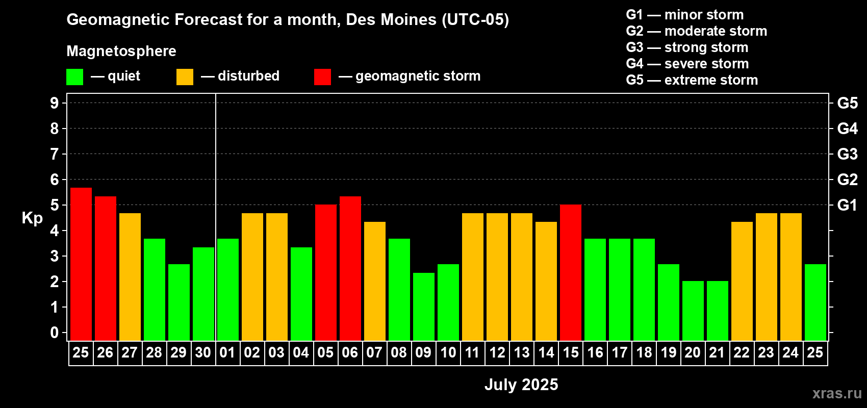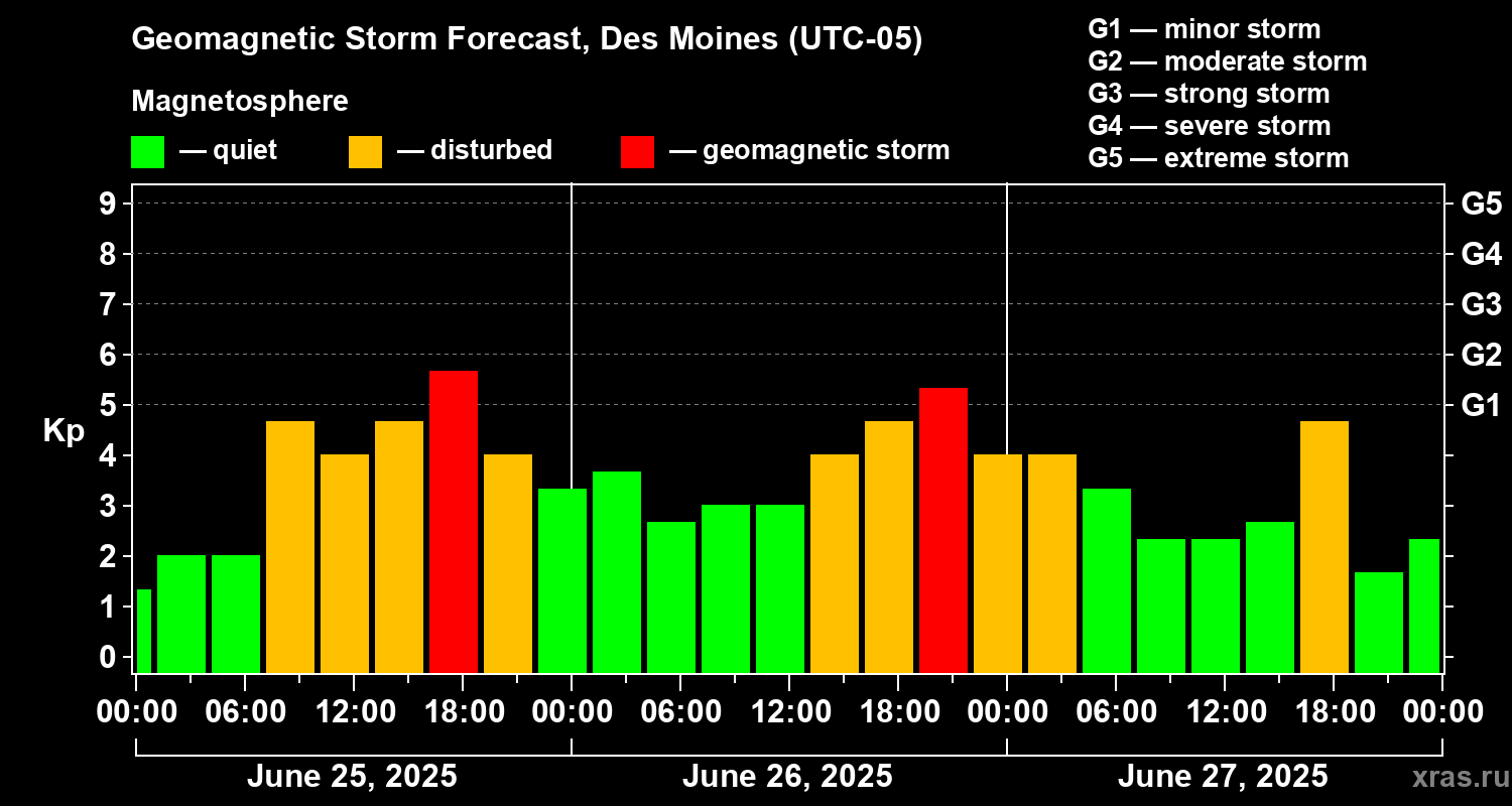 Geomagnetic storm forecast in Des Moines for Jun 25, 2025
