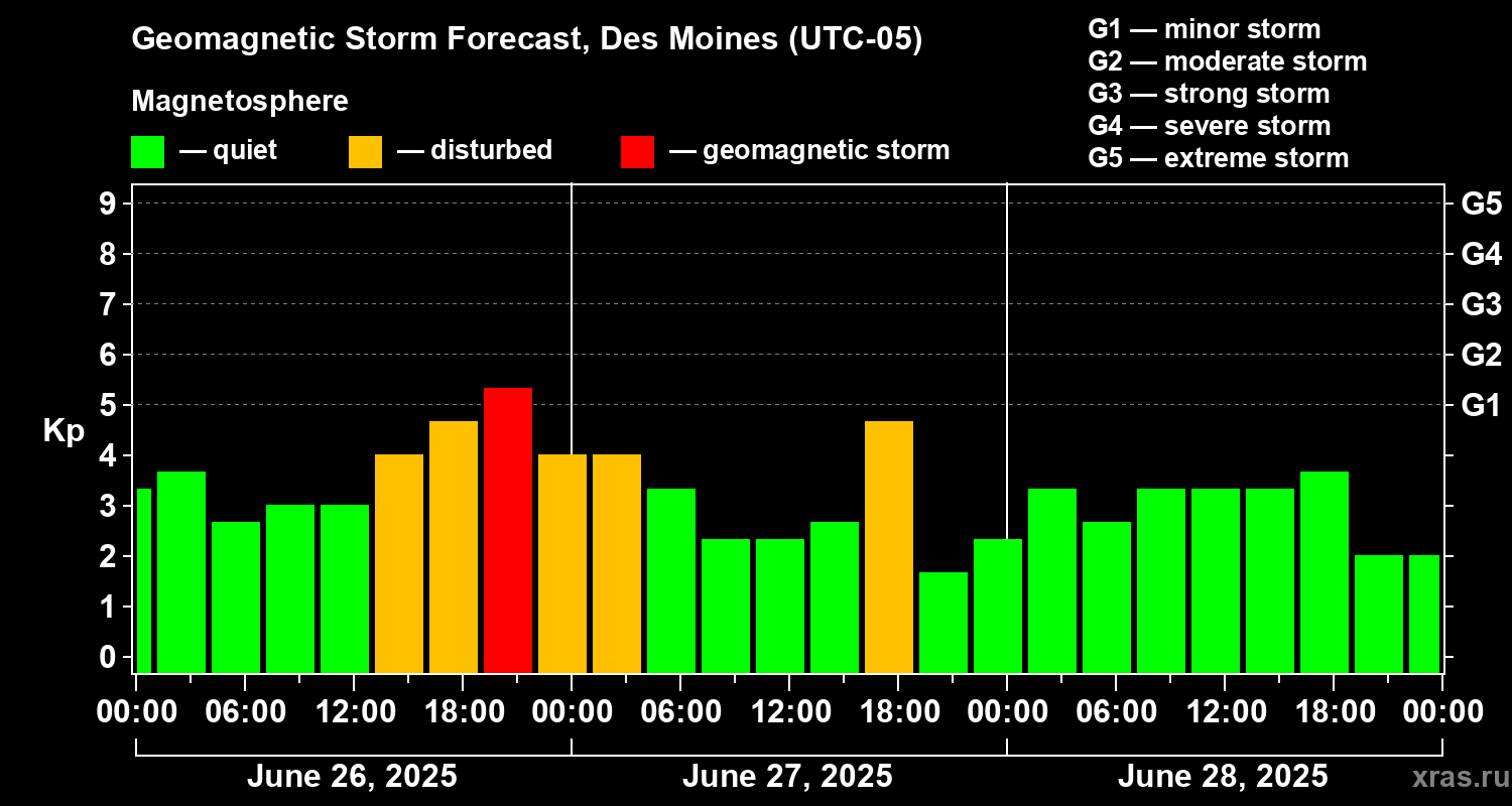 Geomagnetic storm forecast in Des Moines for Jun 26, 2025