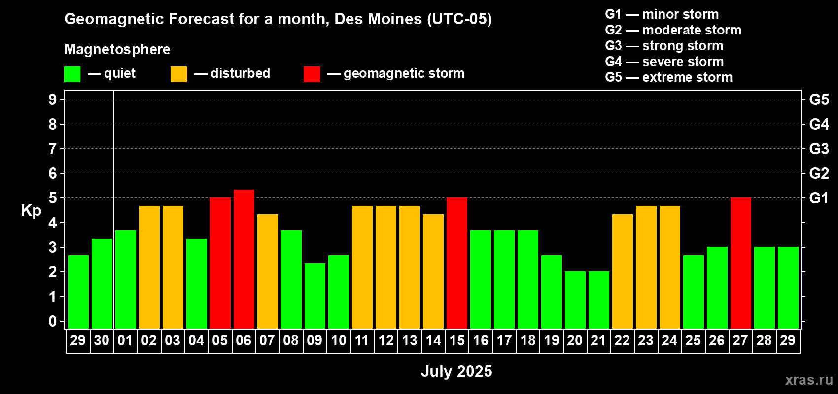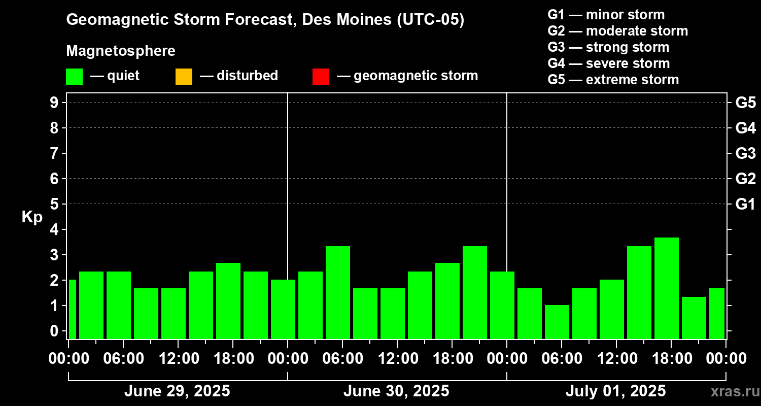 Geomagnetic storm forecast in Des Moines for Jun 29, 2025