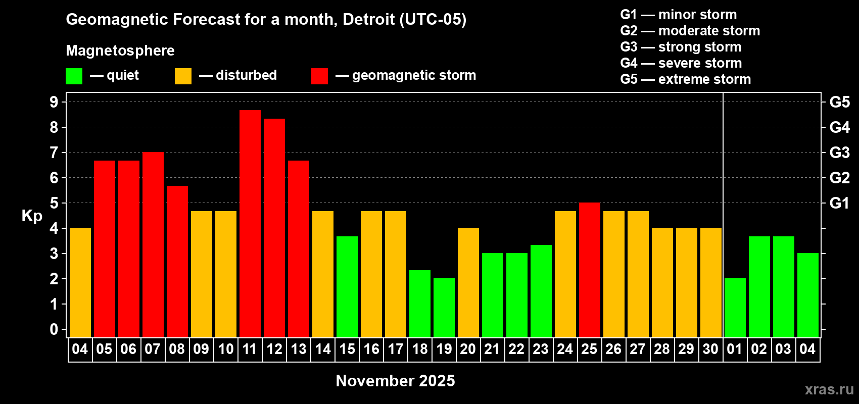 Geomagnetic storm forecast in Detroit for Nov 04, 2025