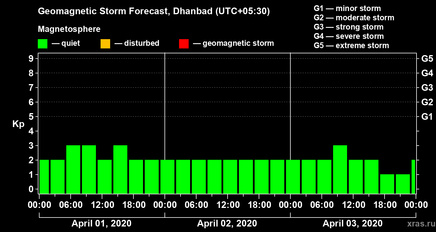 Geomagnetic storm forecast in Dhanbad for Apr 01, 2020