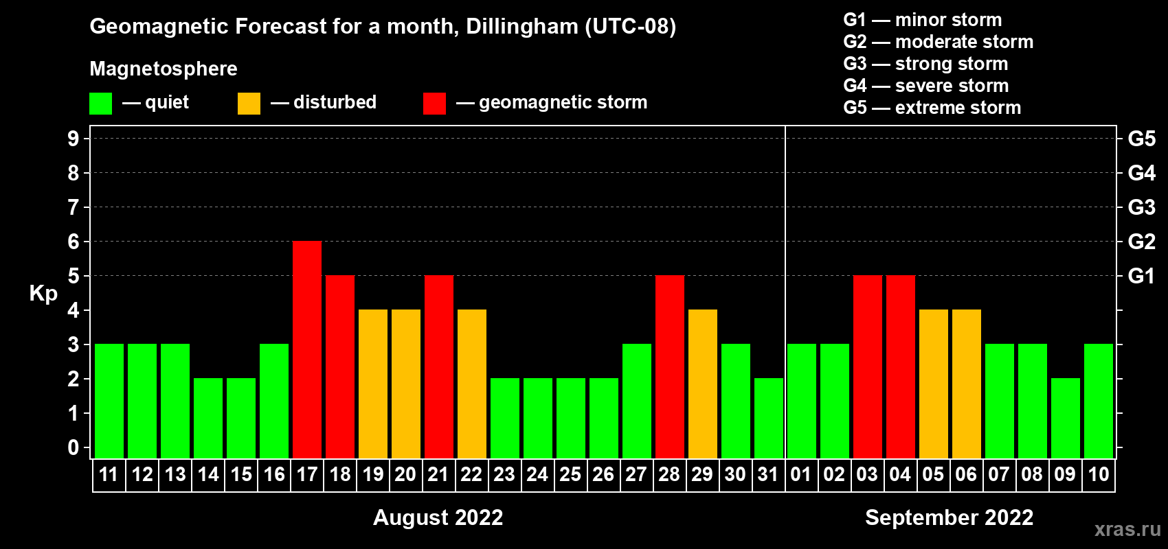 Geomagnetic storm forecast in Dillingham for Aug 11, 2022