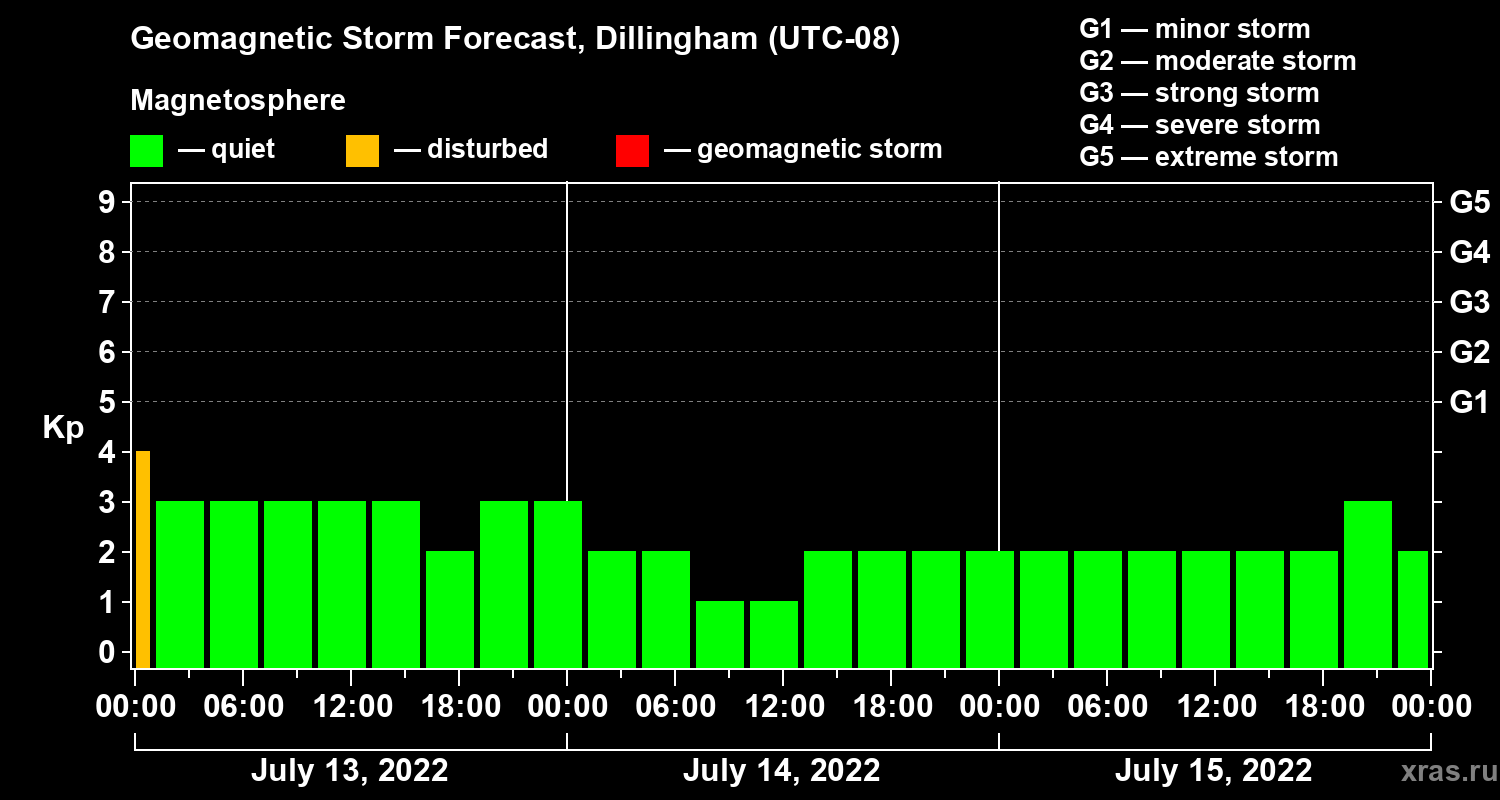 Geomagnetic storm forecast in Dillingham for Jul 13, 2022