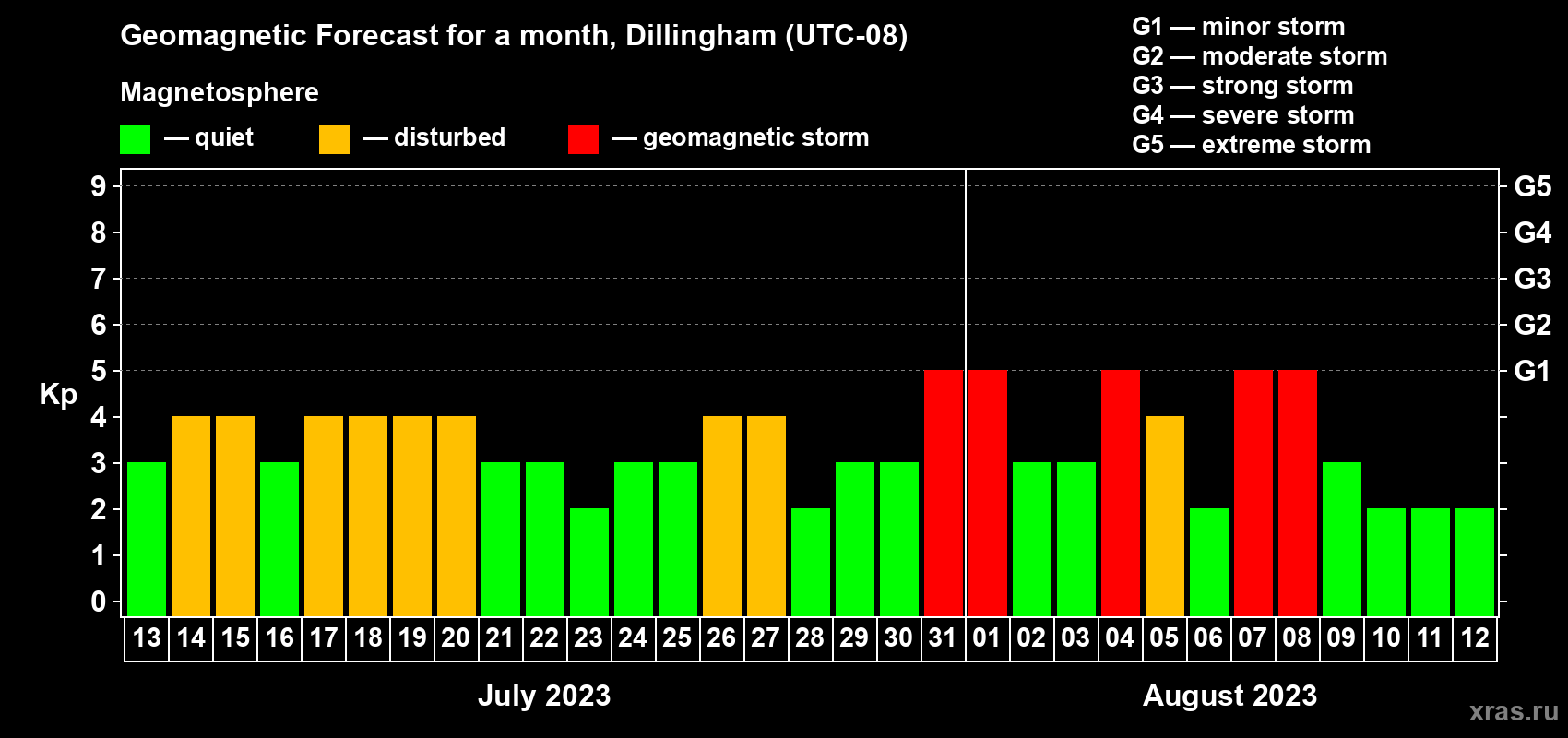 Geomagnetic storm forecast in Dillingham for Jul 13, 2023