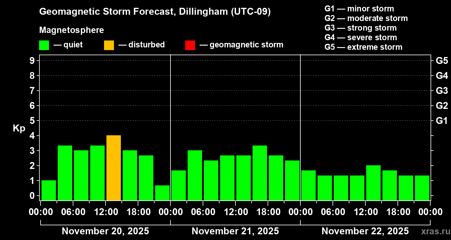 Geomagnetic storm forecast in Dillingham for Nov 20, 2025