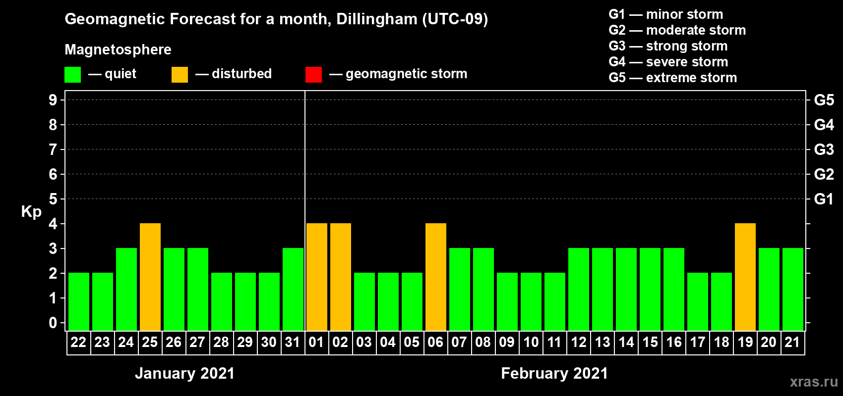 Geomagnetic storm forecast in Dillingham for Jan 22, 2021
