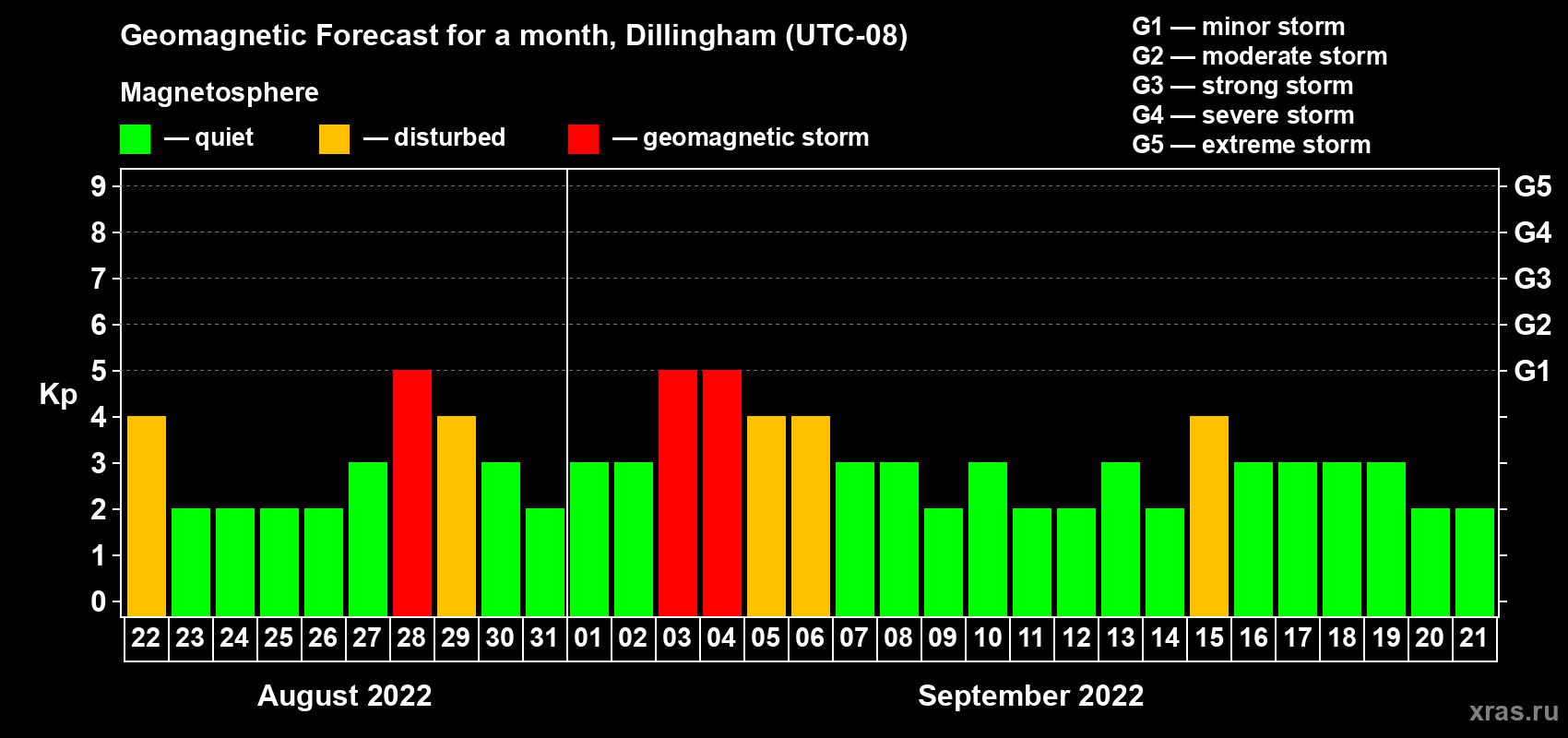 Geomagnetic storm forecast in Dillingham for Aug 22, 2022