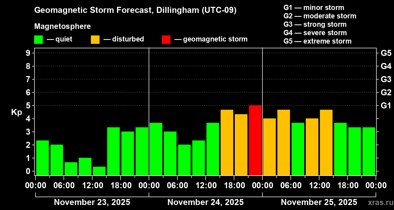 Geomagnetic storm forecast in Dillingham for Nov 23, 2025