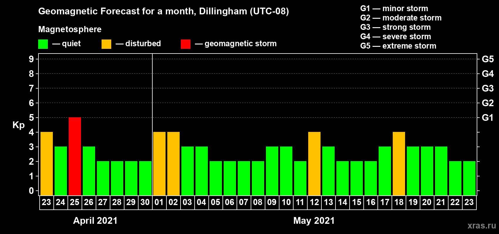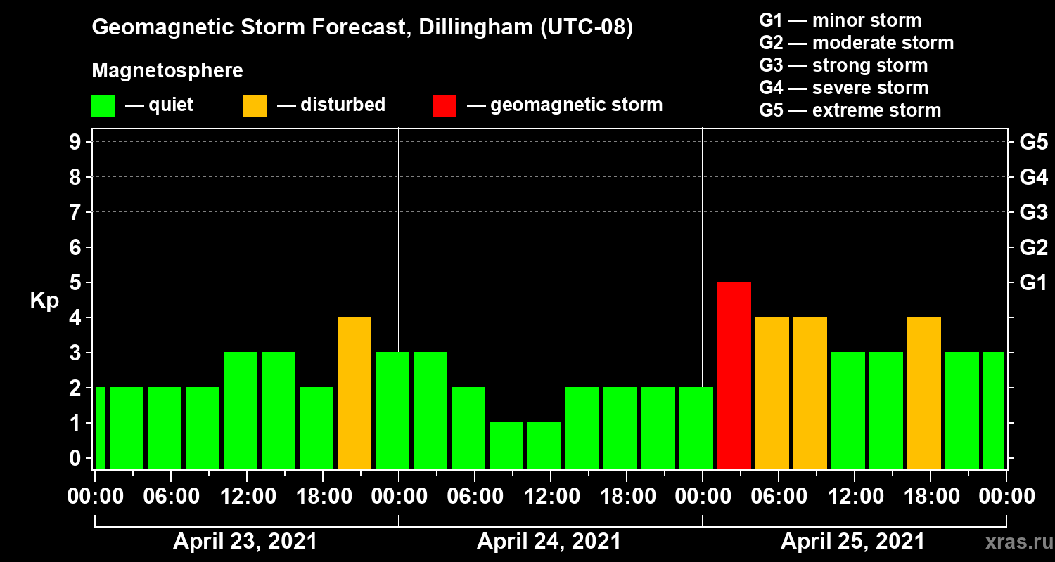 Geomagnetic storm forecast in Dillingham for Apr 23, 2021