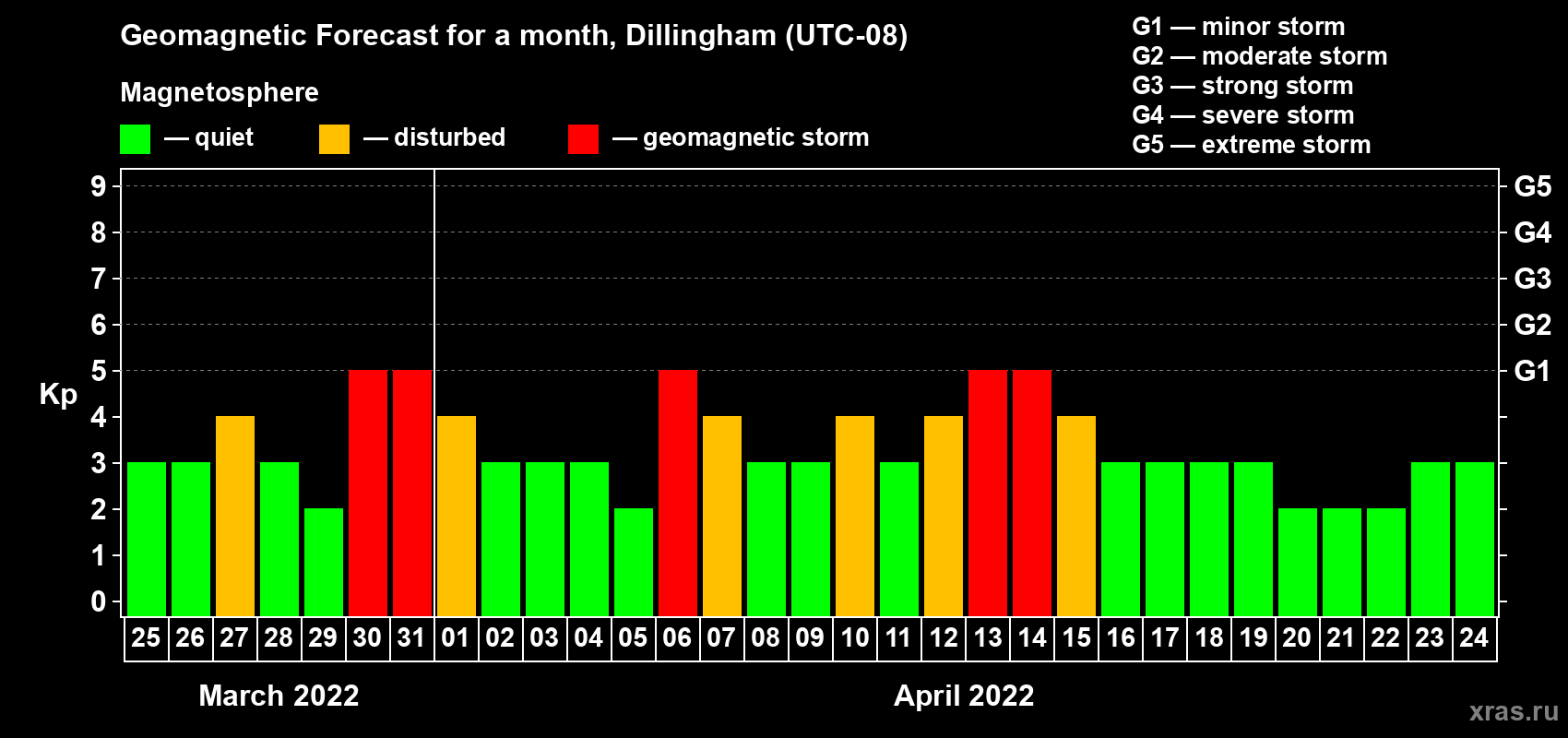 Geomagnetic storm forecast in Dillingham for Mar 25, 2022