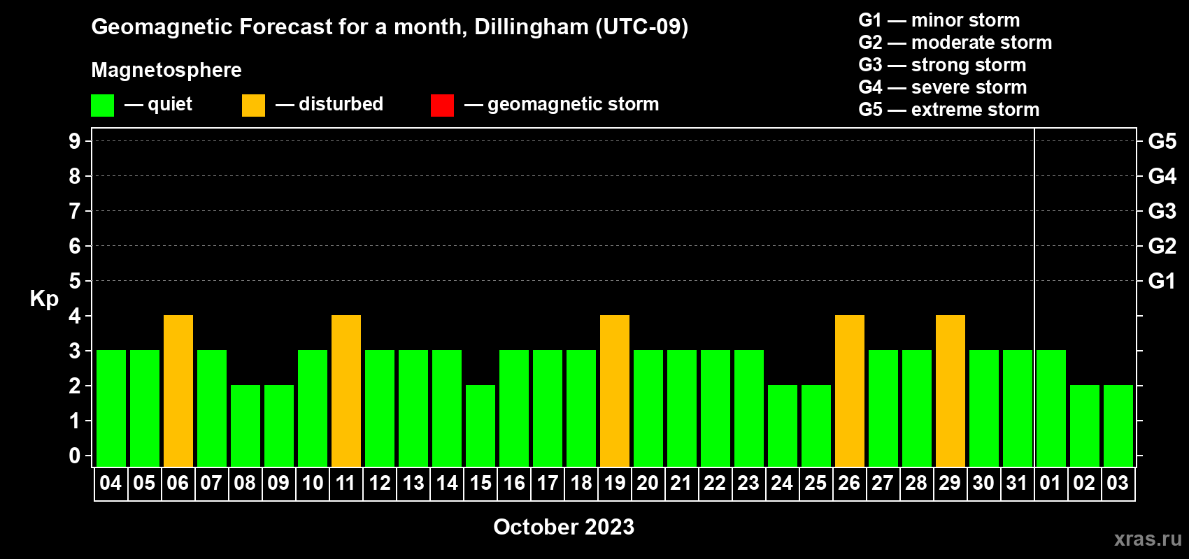 Geomagnetic storm forecast in Dillingham for Oct 04, 2023