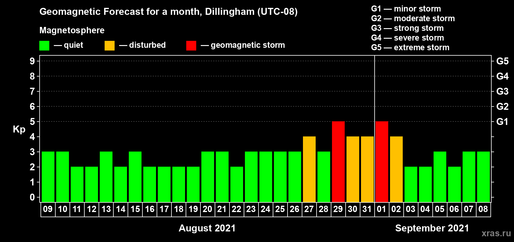 Geomagnetic storm forecast in Dillingham for Aug 09, 2021