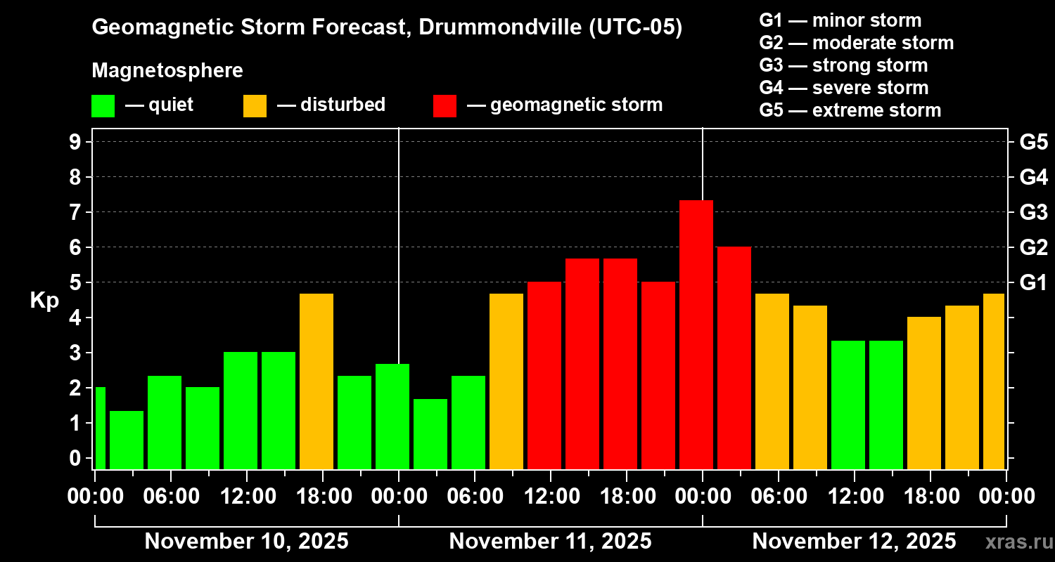 Geomagnetic storm forecast in Drummondville for Nov 10, 2025