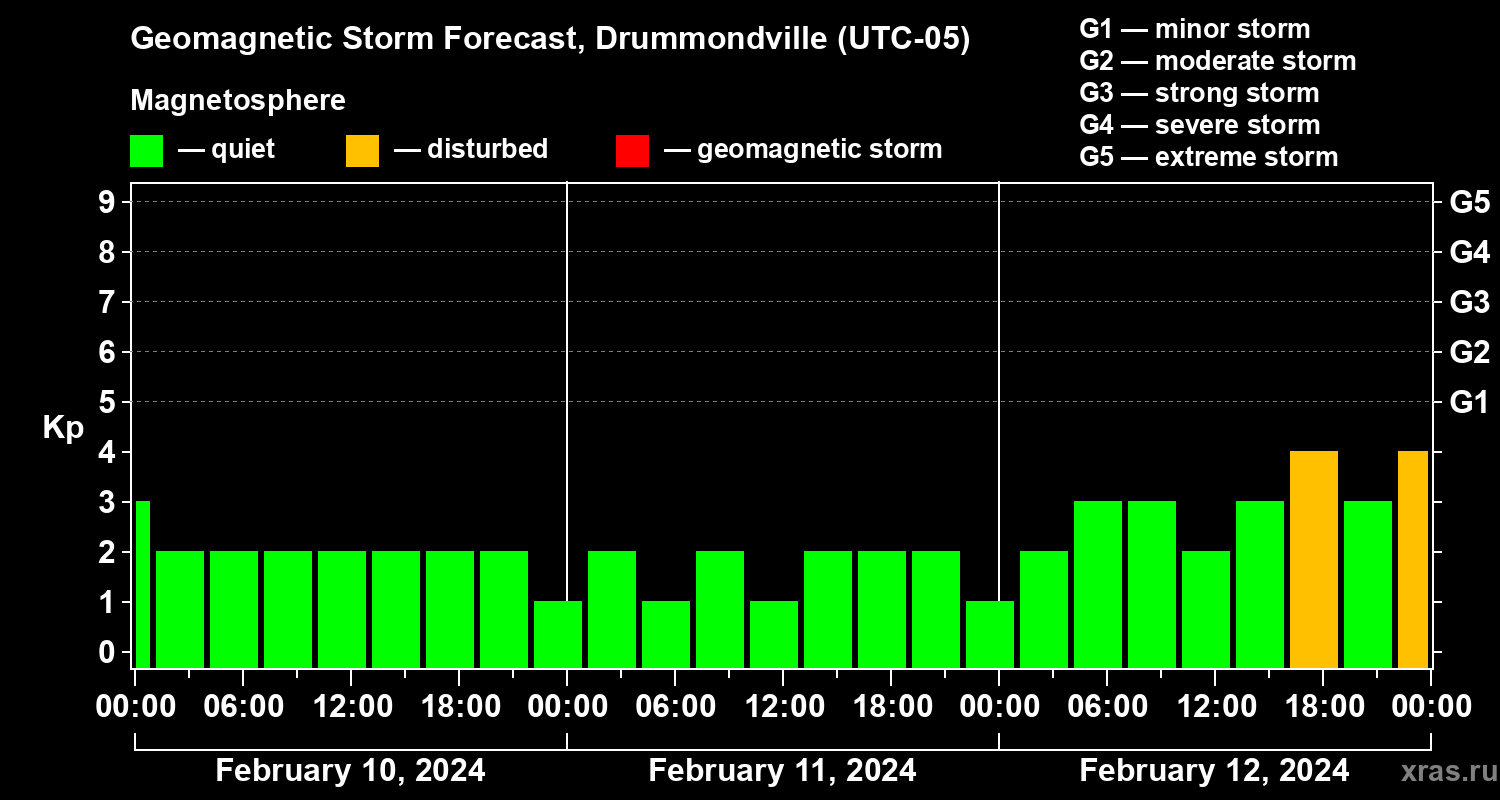 Geomagnetic storm forecast in Drummondville for Feb 10, 2024