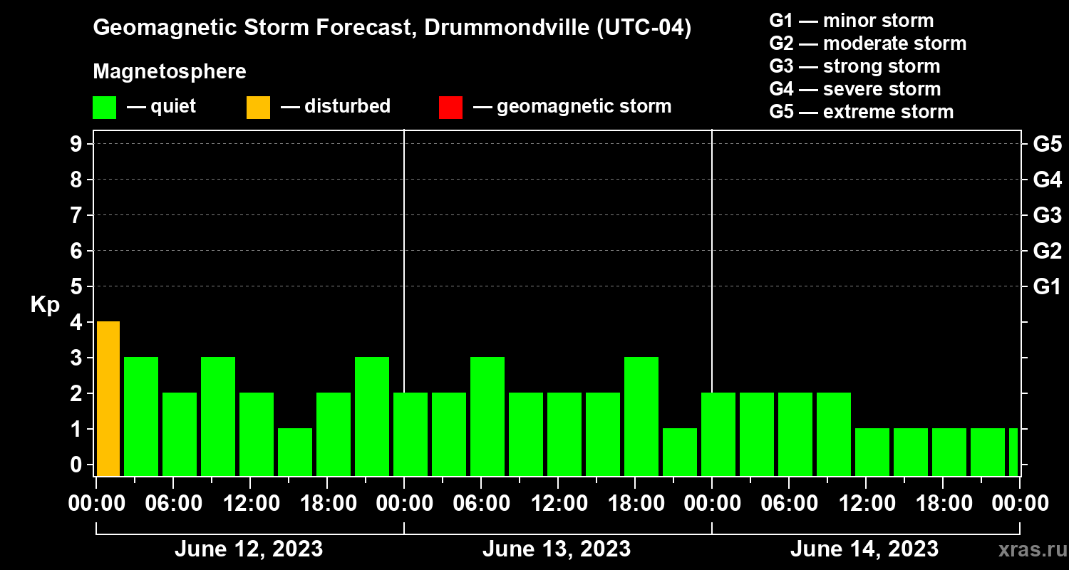 Geomagnetic storm forecast in Drummondville for Jun 12, 2023