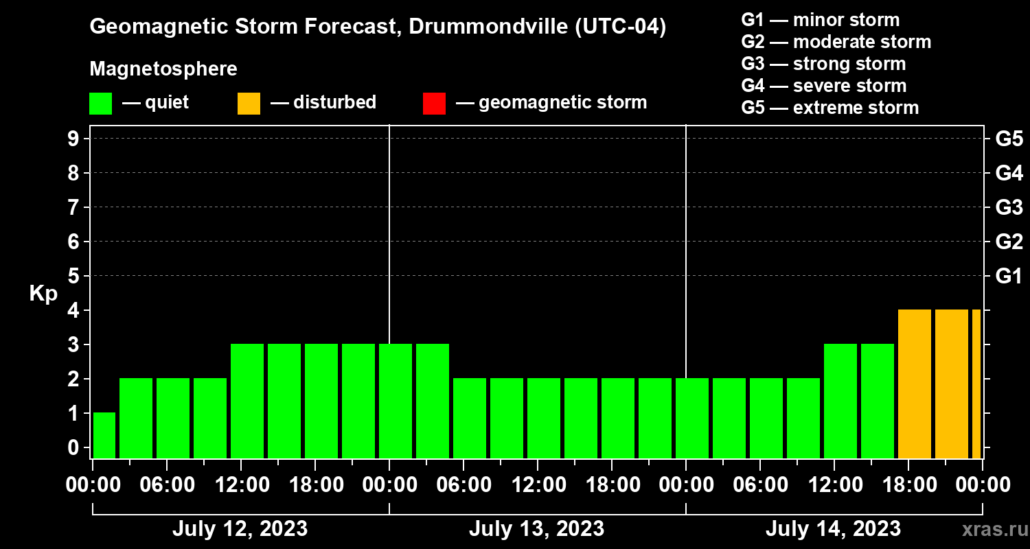 Geomagnetic storm forecast in Drummondville for Jul 12, 2023