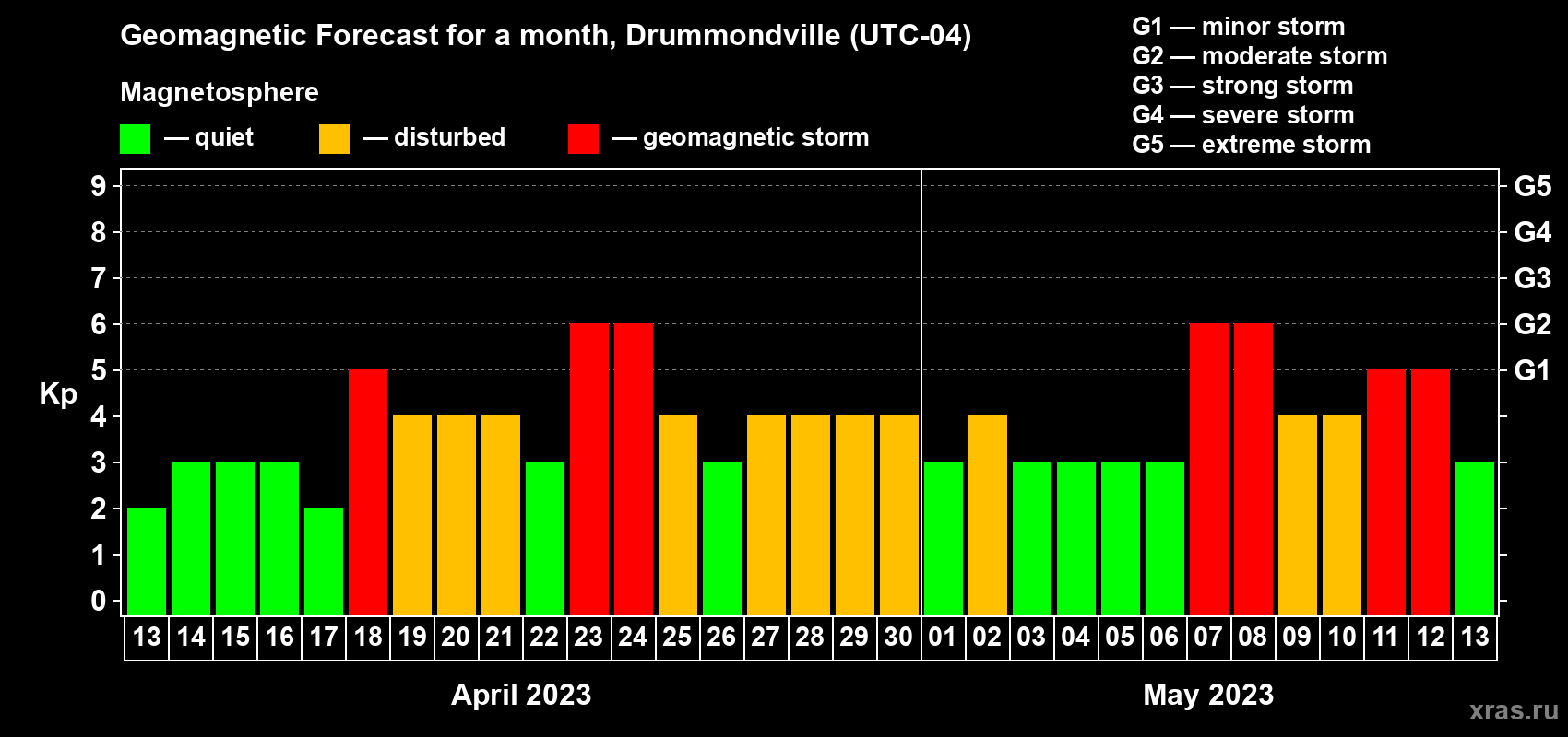 Geomagnetic storm forecast in Drummondville for Apr 13, 2023